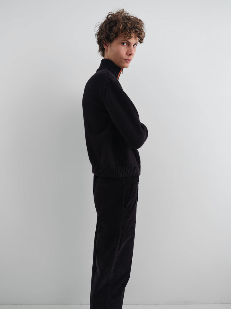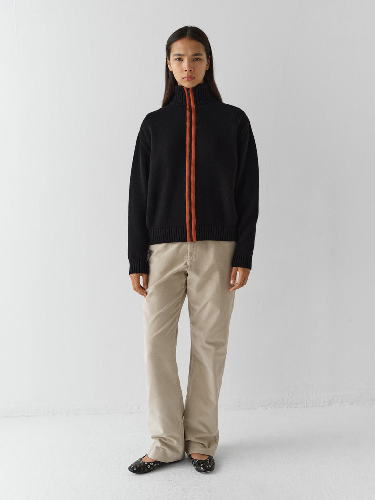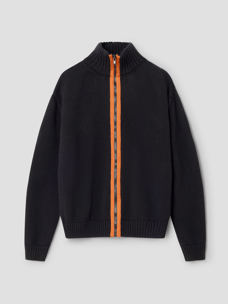 Black wool jacket with contrasting orange front stripe.