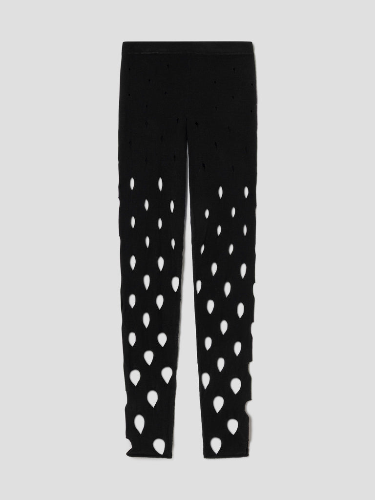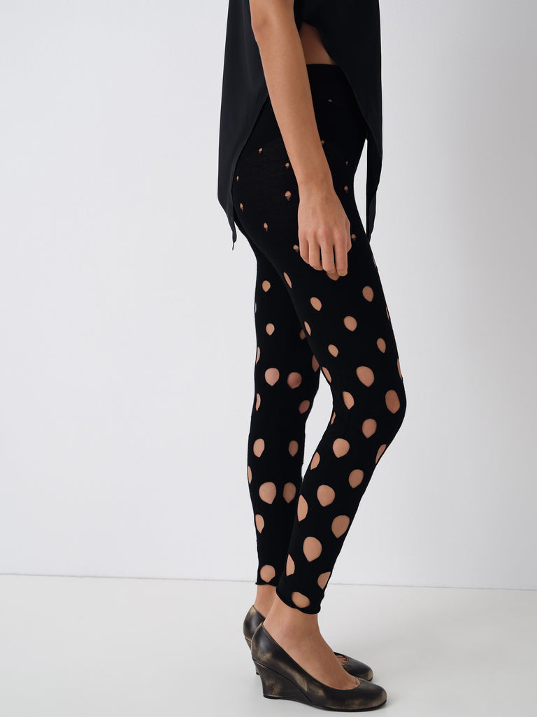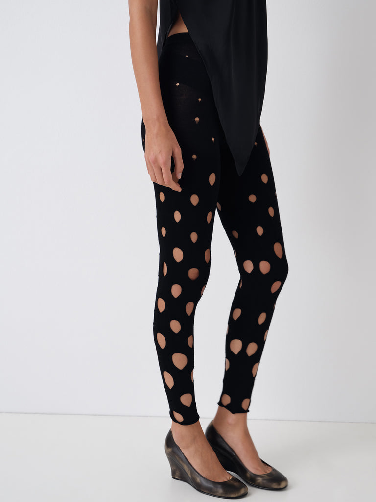 Black knit leggings with teardrop cut-outs.