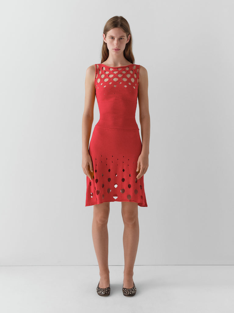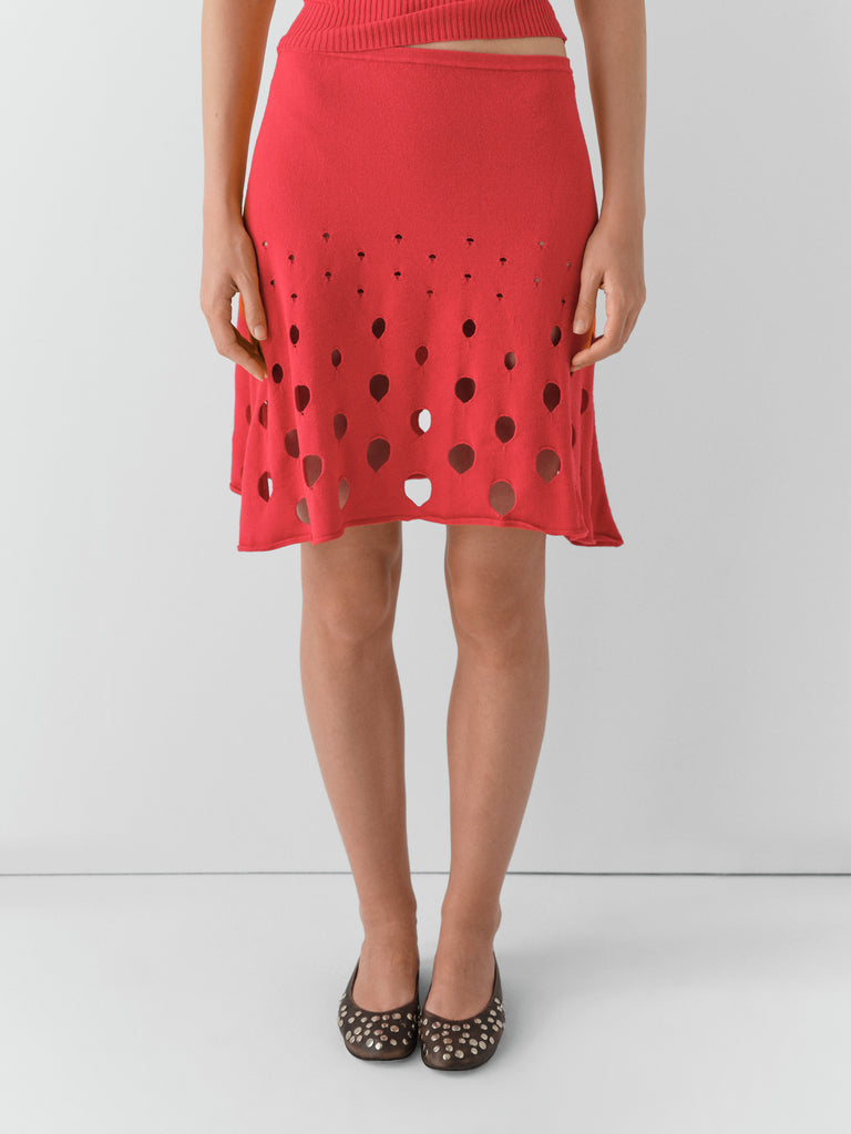 Red mini skirt with circular cut-outs.