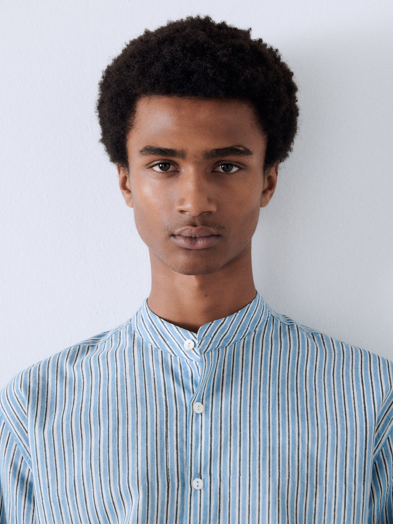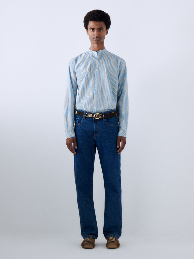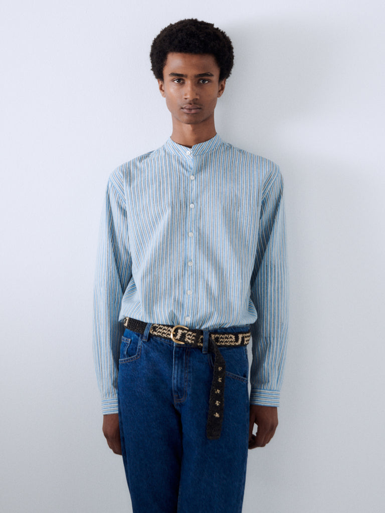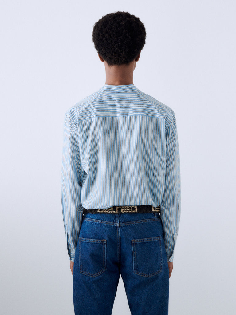 Long-sleeved shirt with Mao collar. Printed in traditional technique of block printing in color blue, white and black stripes.