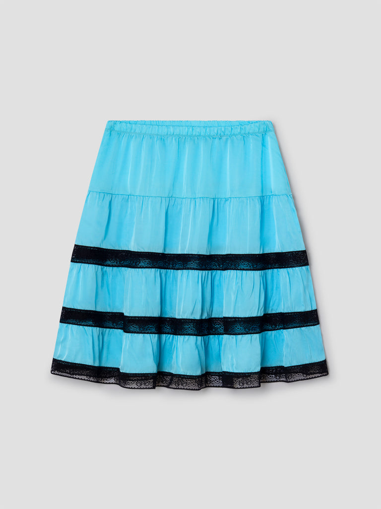 Light blue satin low-rise midi skirt with black lingerie trims.