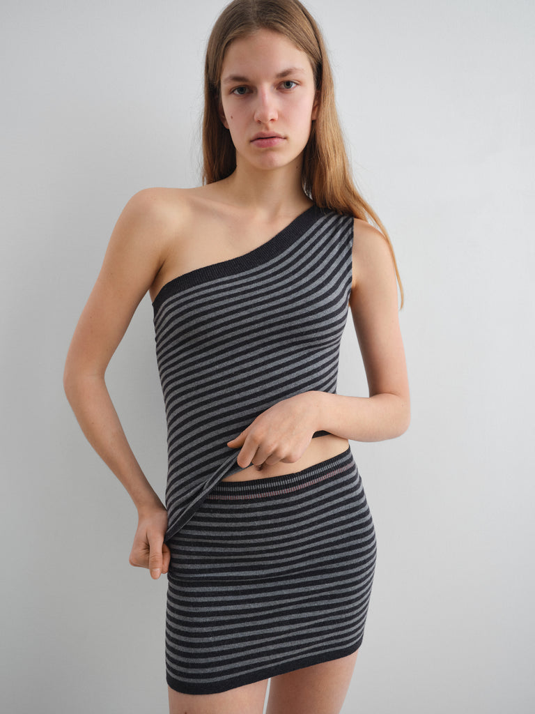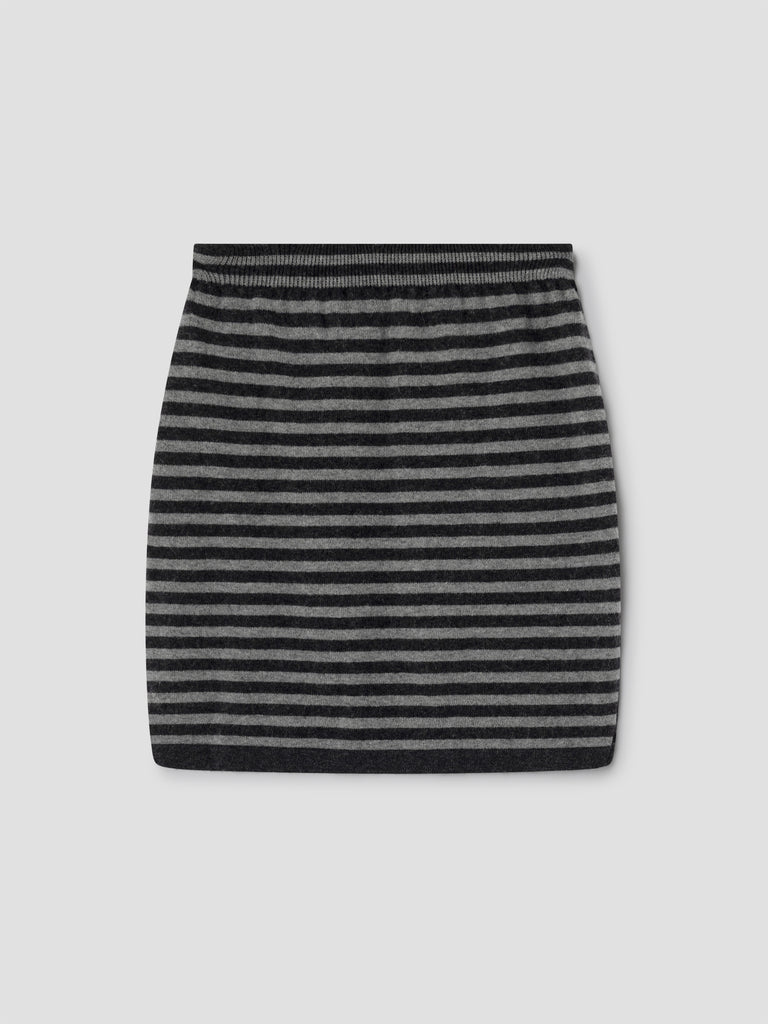 Grey and black striped knit mini skirt with dark grey back contrast.