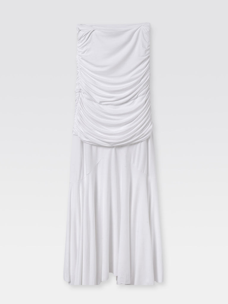 Asymmetrical maxi bandeau dress, with gathered detailing in white.