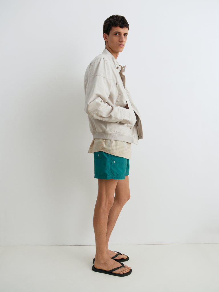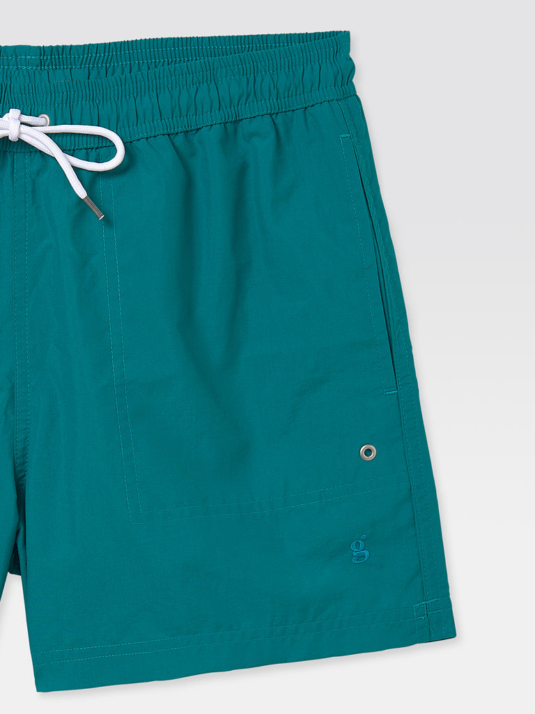 Green men's summer swim shorts. Designed for men and woman, in deep green with an elasticated waistband and adjustable drawstring. Features side seam pockets and a breathable mesh lining for comfort.