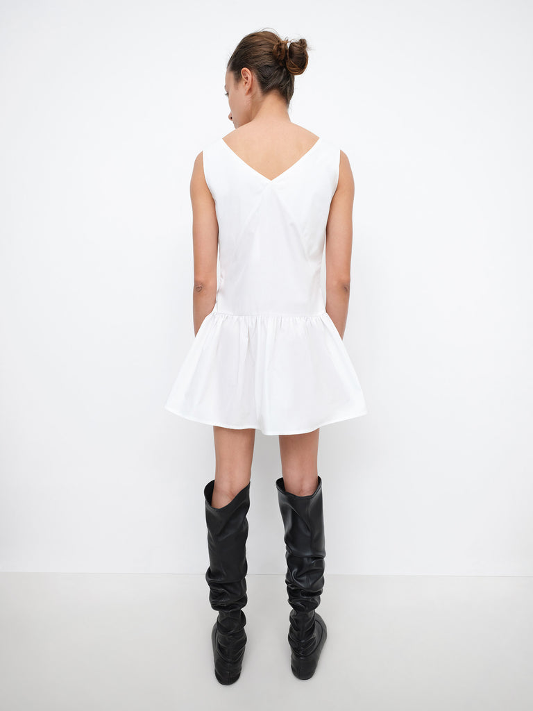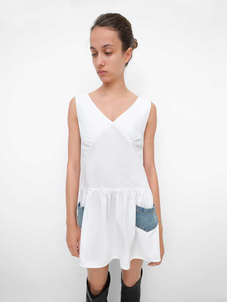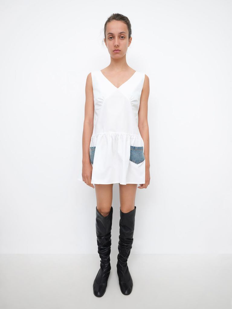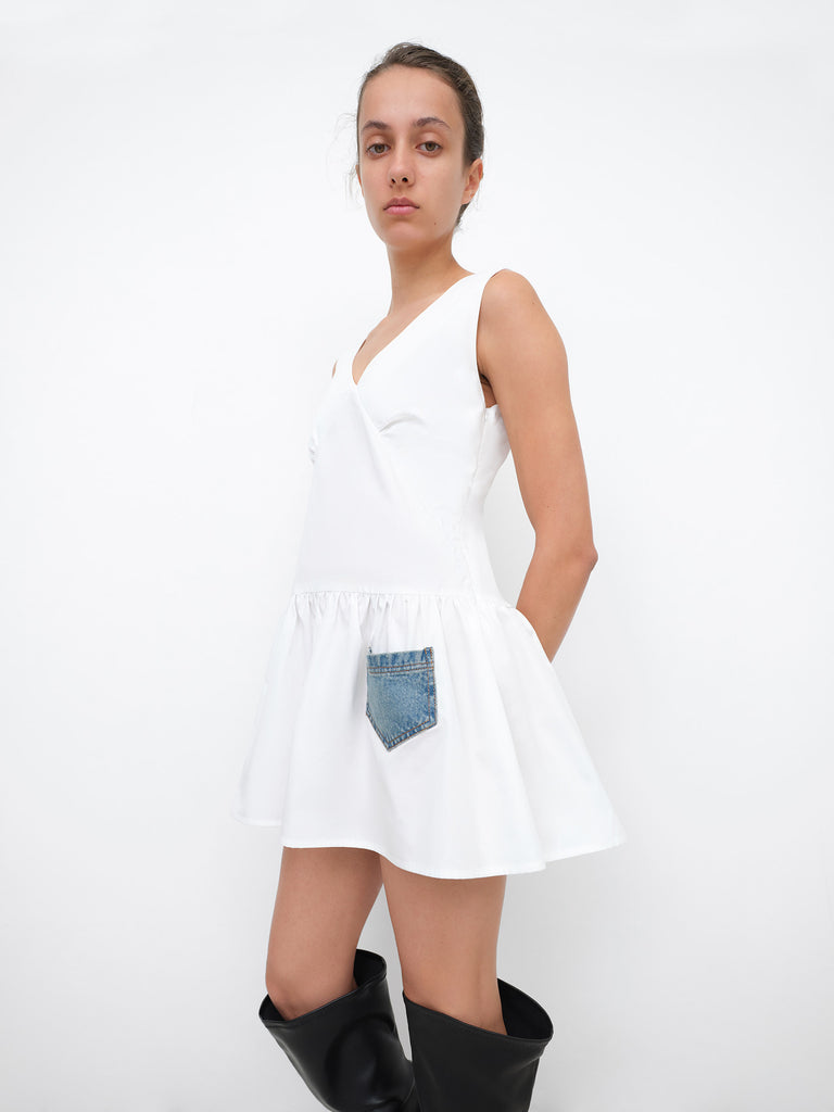 Crafted from crisp white poplin, this fitted white women's dress features a flattering V-neckline and an open V-back. Its sleeveless design is complemented by a gathered skirt with a flounce, while contrasting denim pockets. Finished with an invisible side zipper for a seamless silhouette.