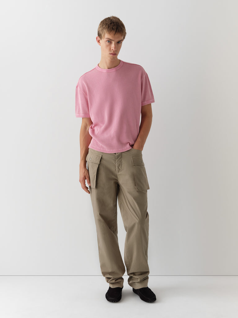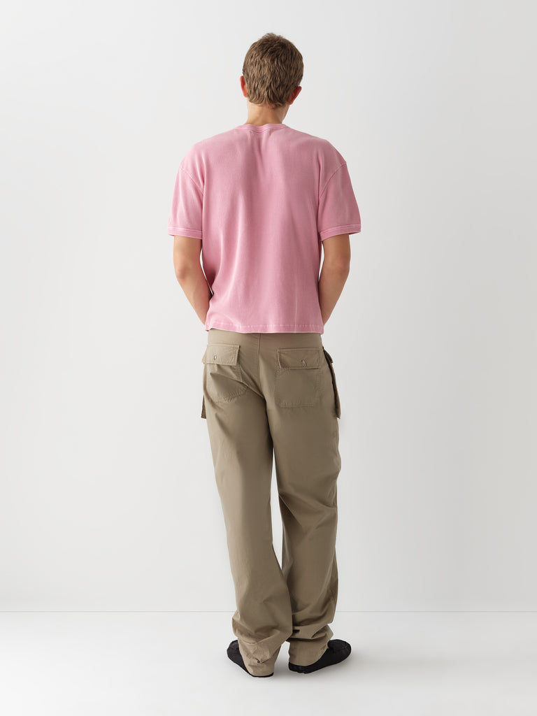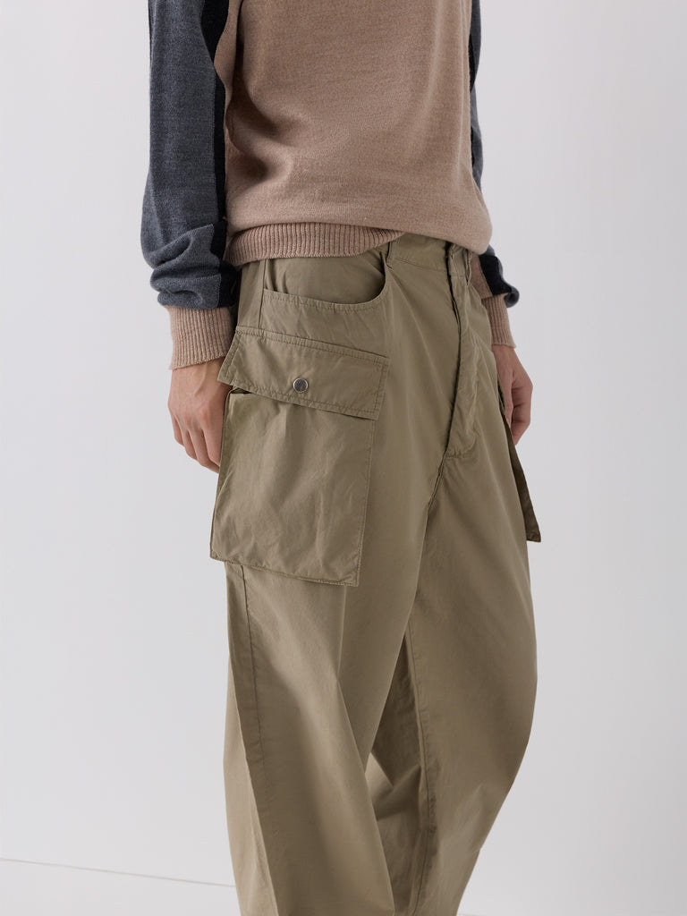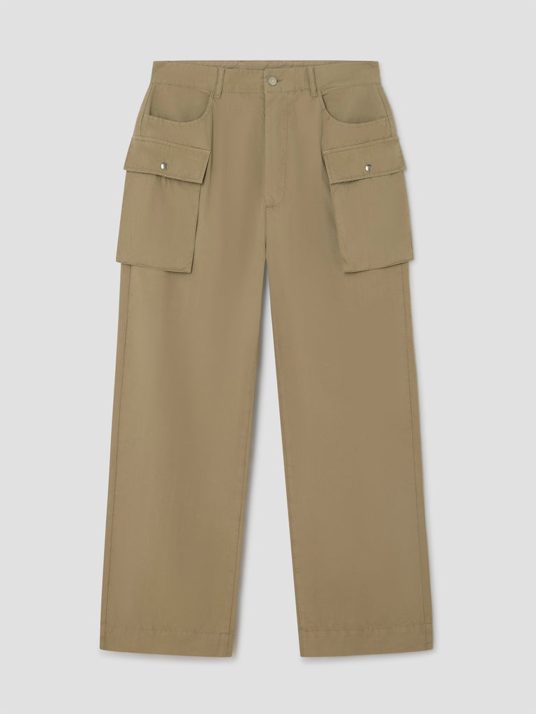 Khaki straight-leg trousers with cargo-inspired pockets.