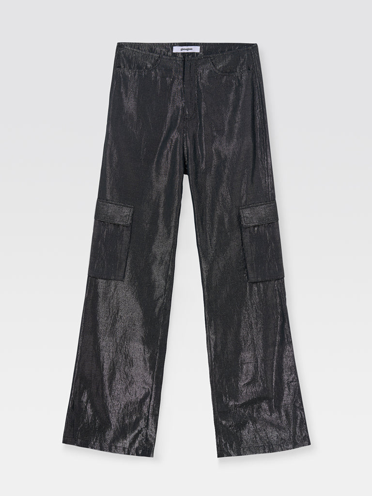 Mid-waist trousers with frontal invisible zip closure, side scoop and cargo pockets. Crafted from a cotton and nylon lurex fabric with a metallic finish in black.