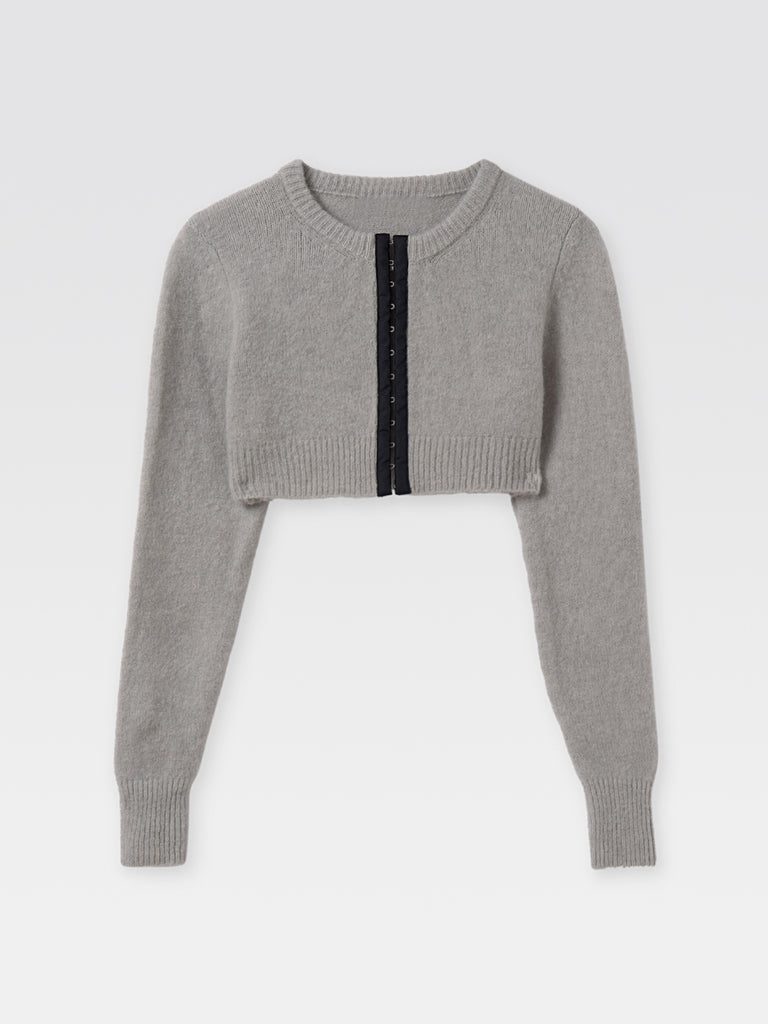 Knitted short cardigan in grey, fitted fit, closed with a contrast hook and eye strap on the front.
