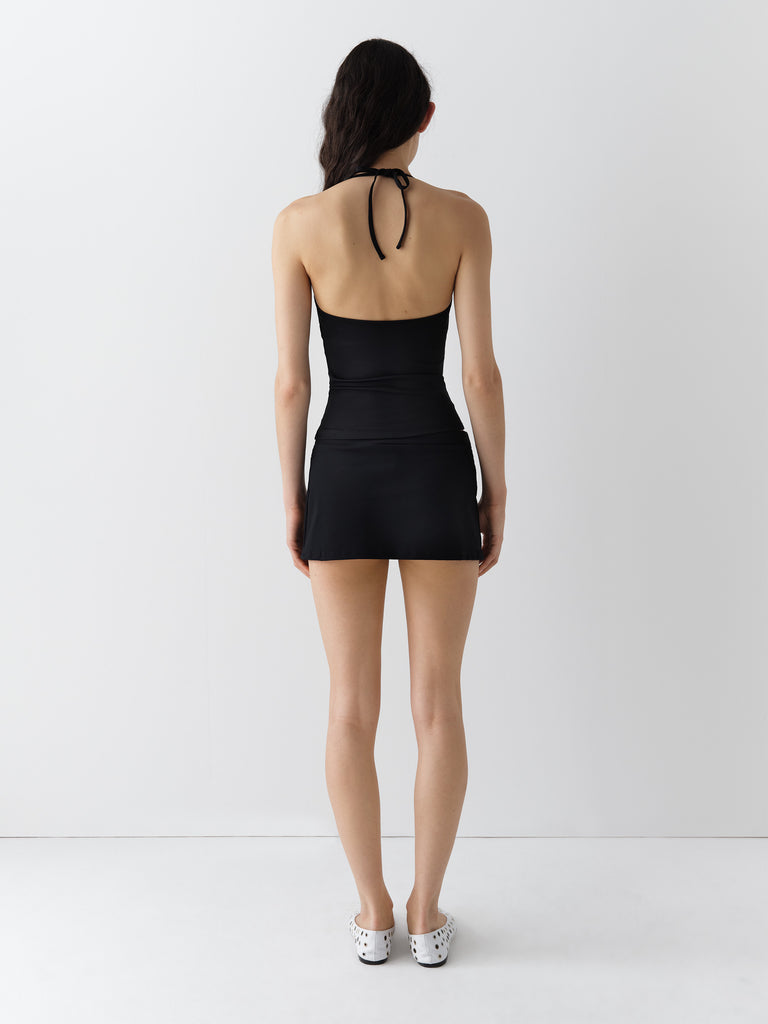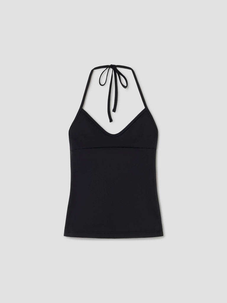 Black fitted halter top with deep U neckline.