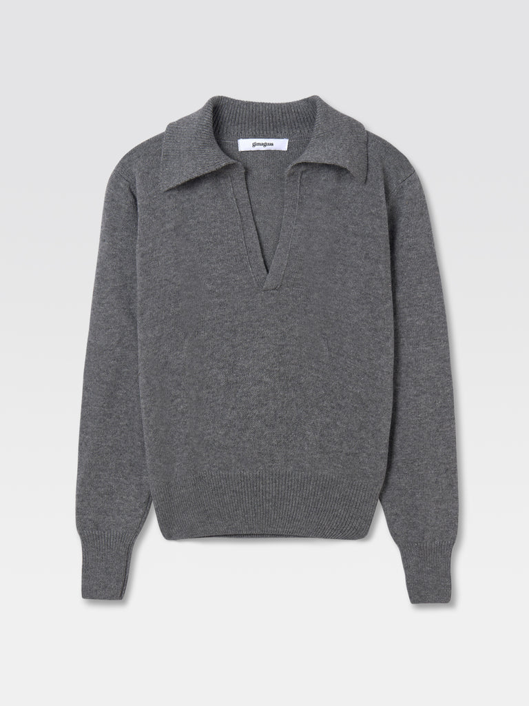 Long sleeve polo jumper with open neck in grey.
