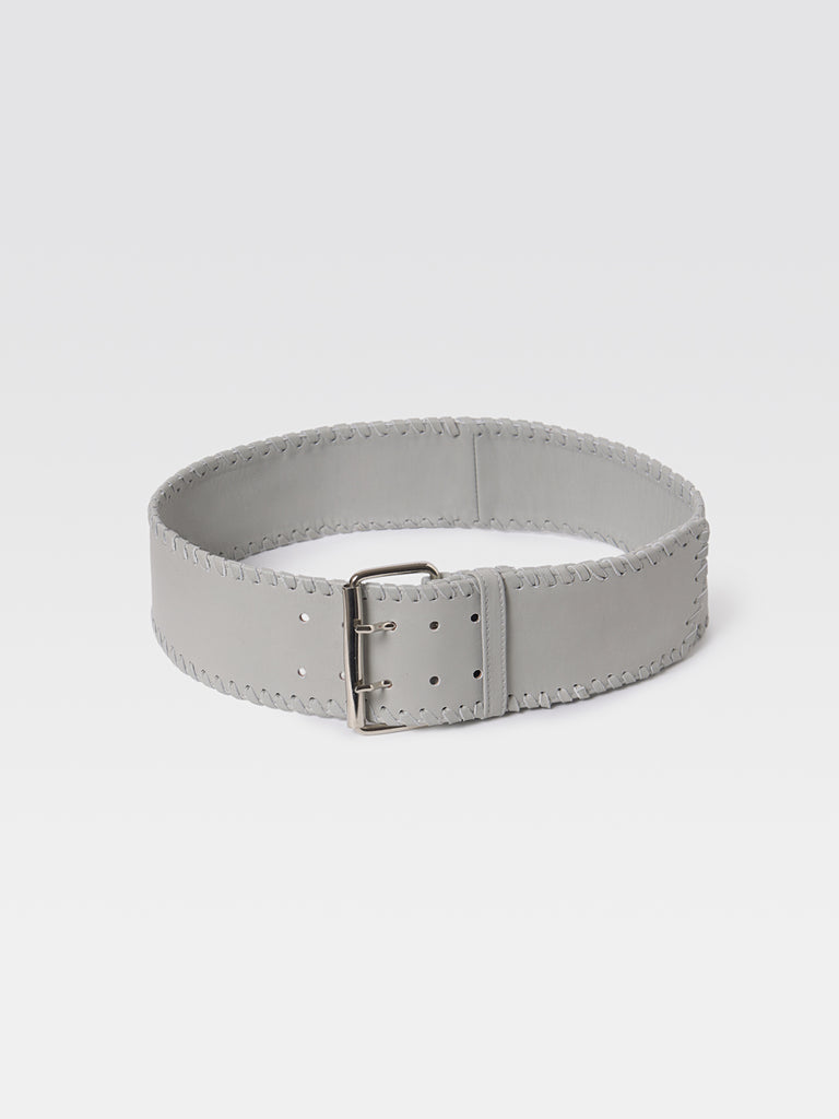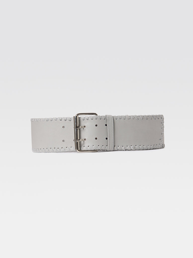 Grey leather belt with a metal adjustable double buckle and plaited ribs on the sides.