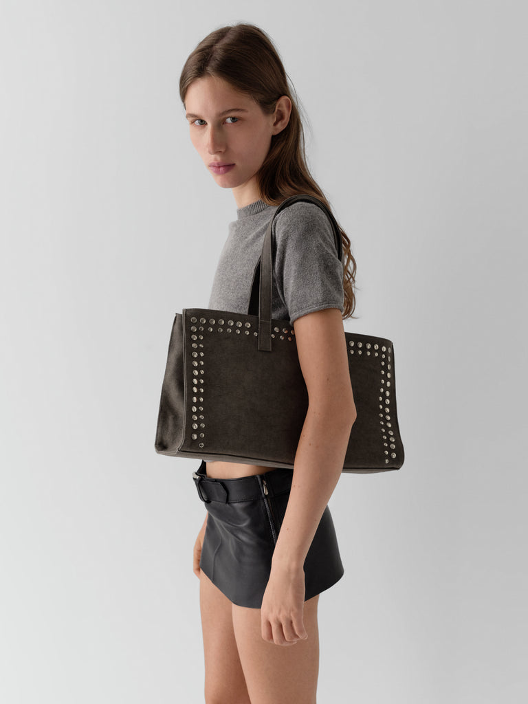 Grey shopper bag with silver-tone studs.