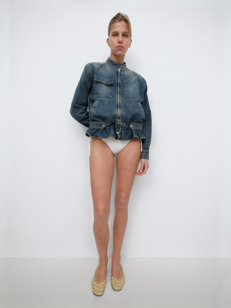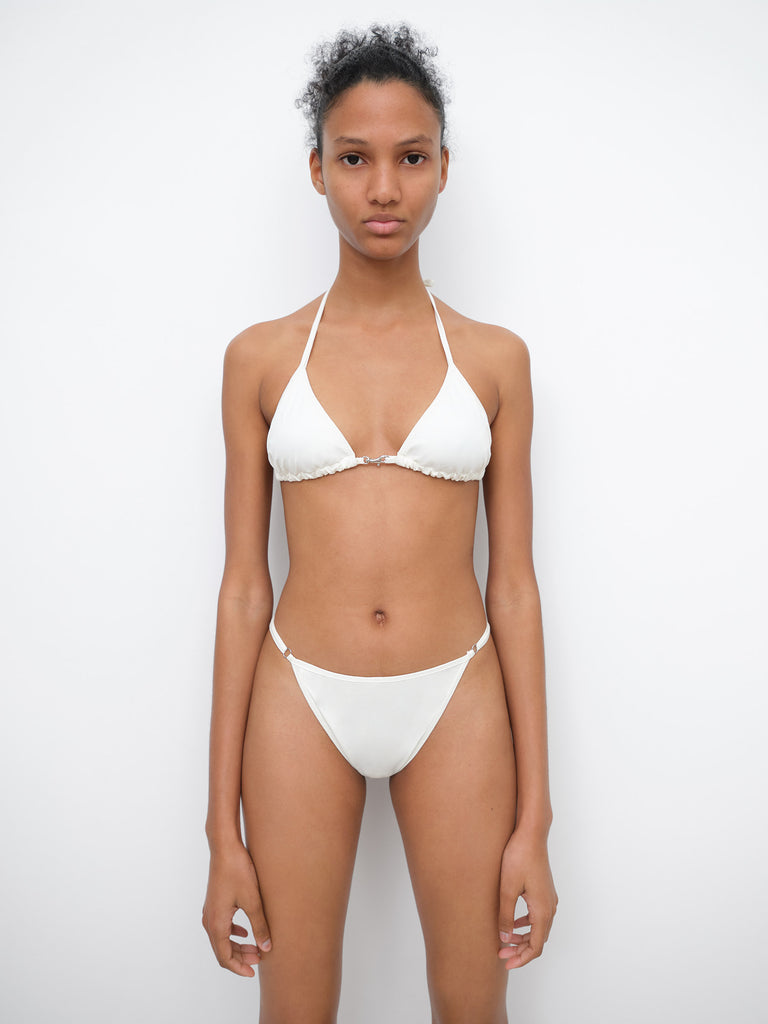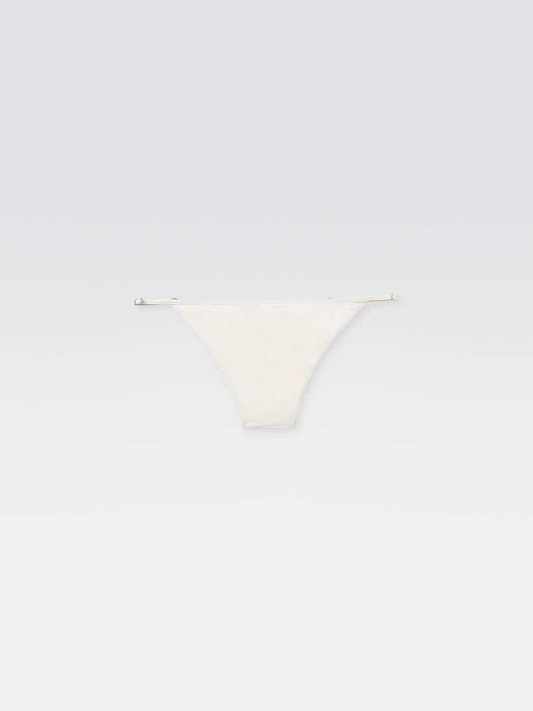 White bikini bottom for women with a wrinkled-effect fabric. Cut in a flattering culotte shape and finished with adjustable thin side straps. Minimal, swim-ready silhouette.
