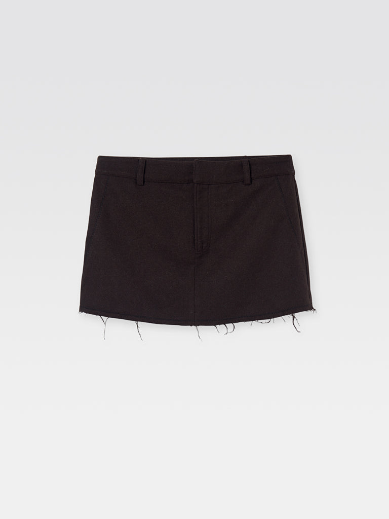 Mini skirt made from wool fabric, featuring color contrast zig-zag stitching in brown.