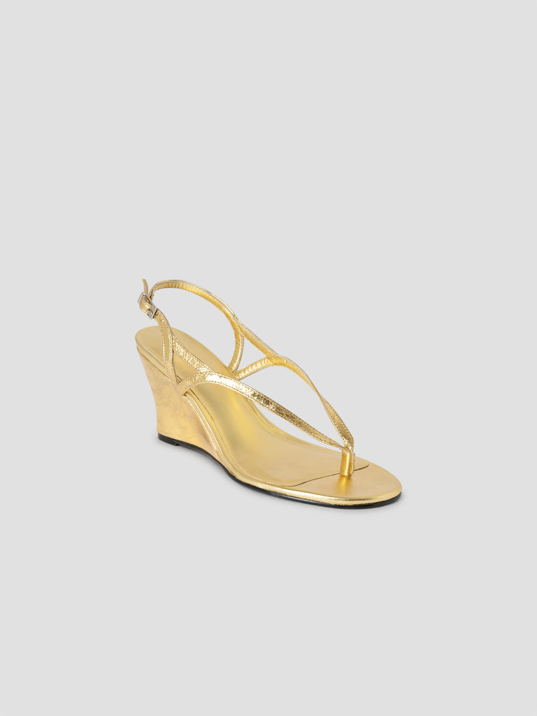 Gold patent leather wedge sandals with a glossy finish.