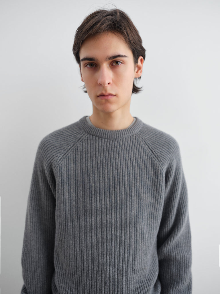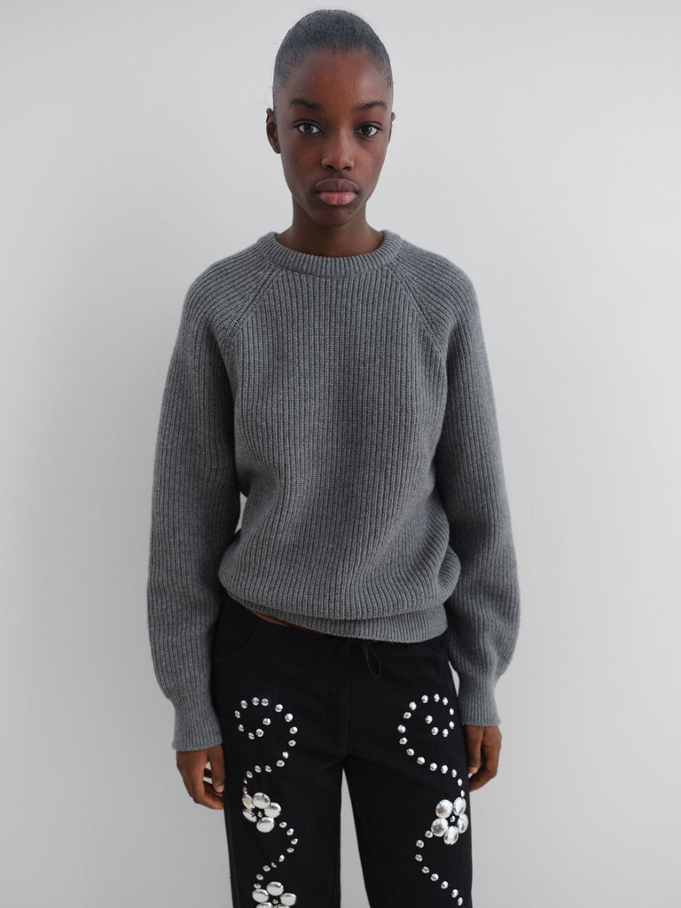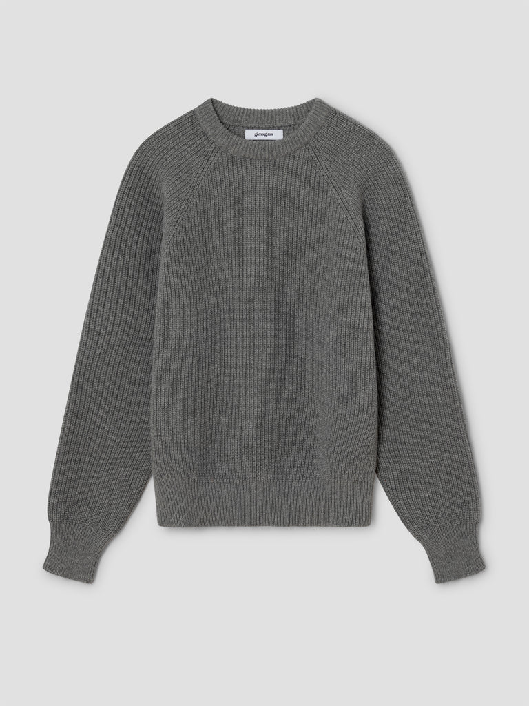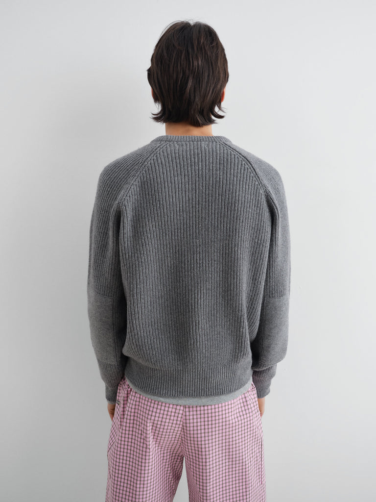 Grey ribbed jumper with raglan sleeves.