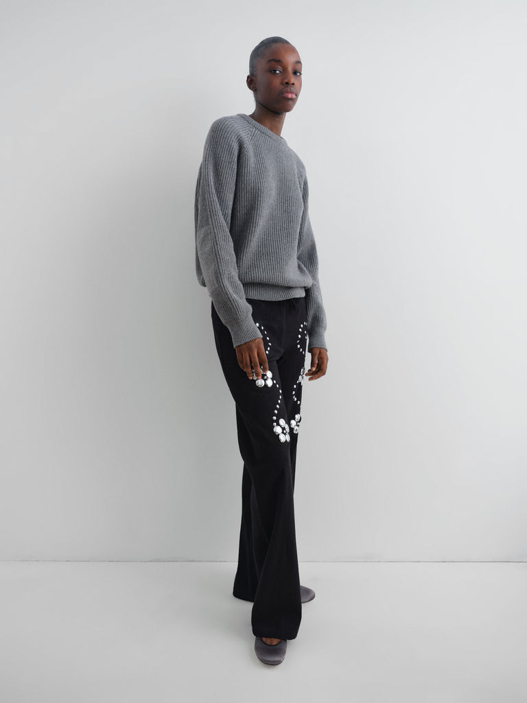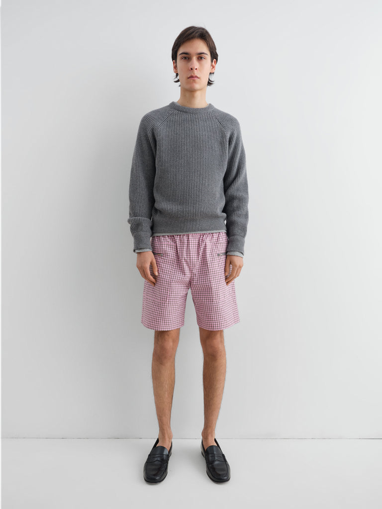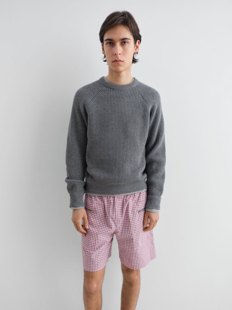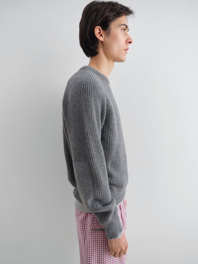 Grey ribbed jumper with raglan sleeves.