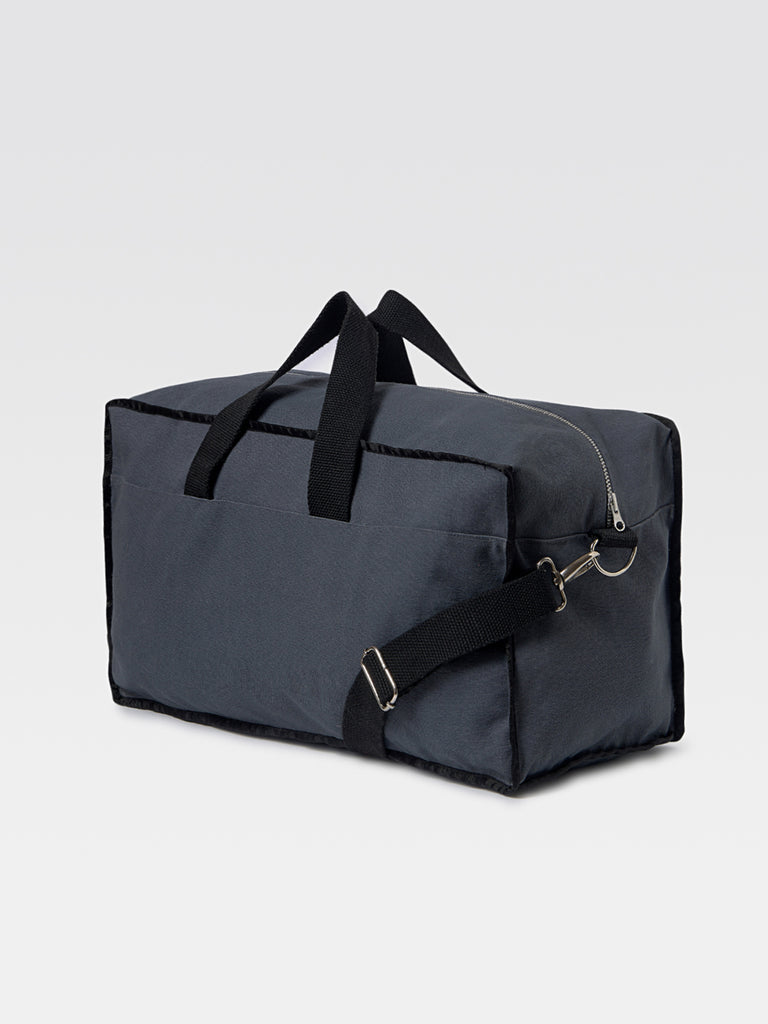 Cotton canvas trip bag in grey, featuring an outside pocket with embroidered "G", two short straps, and a long and regulable strap.