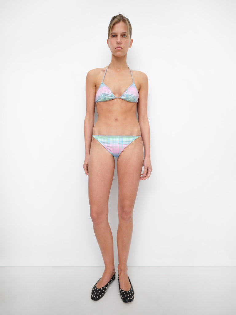 Women’s triangle bikini bottom in grey and pink plaid. Features adjustable grey side straps and matching trim. Fully lined in fast-drying technical fabric.