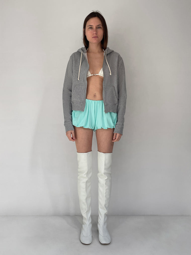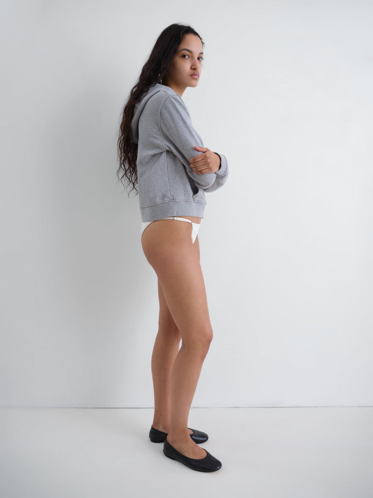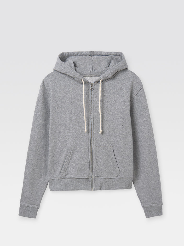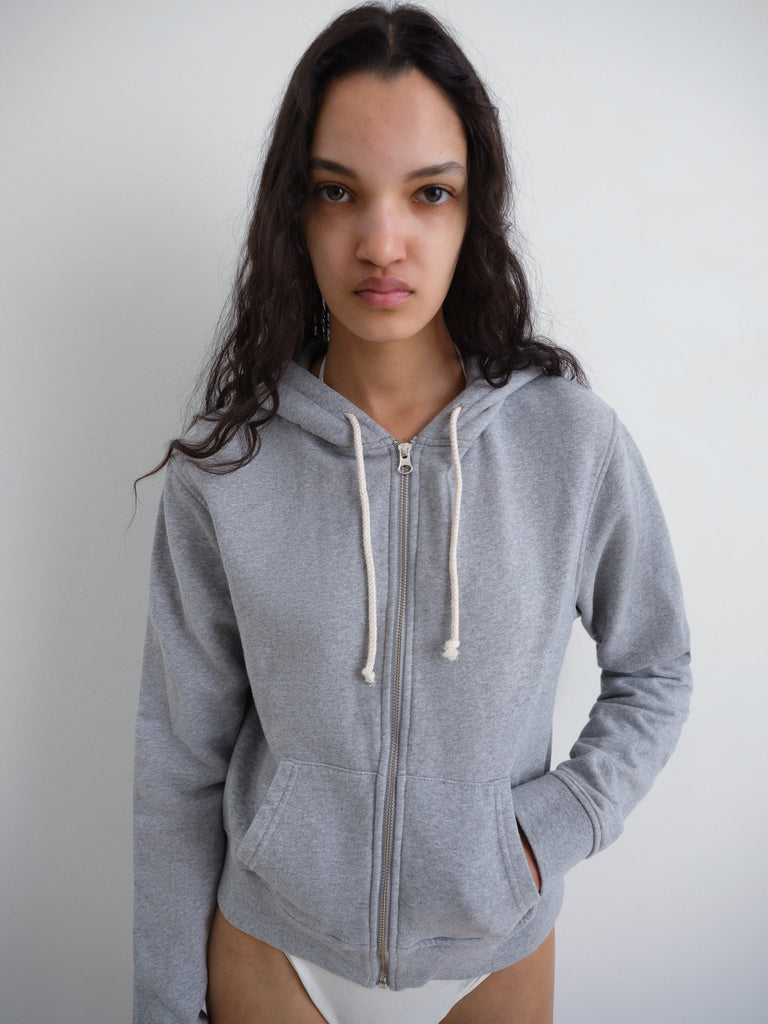 Women's hoodie in grey fleece with long sleeves and a matching fabric hood. Features the Gimaguas logo embroidered on the back at waist level, a front kangaroo pocket, and ribbed details at the cuffs and waist. Designed with a flared hem for added movement. Central metallic zipper closure. Regular fit.