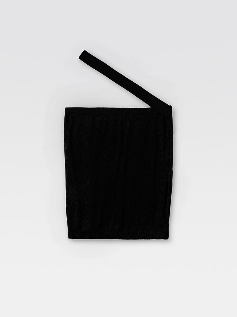 Black asymmetric women's top in soft knit. Designed with a strapless neckline and a single diagonal strap. Fitted at the bust with a relaxed drape through the body. Ribbed trims at the hem add structure to the fluid shape.