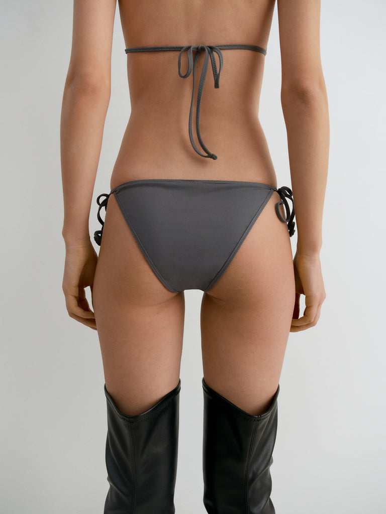 Grey women bikini bottom with adjustable side ties crafted from the same fabric.