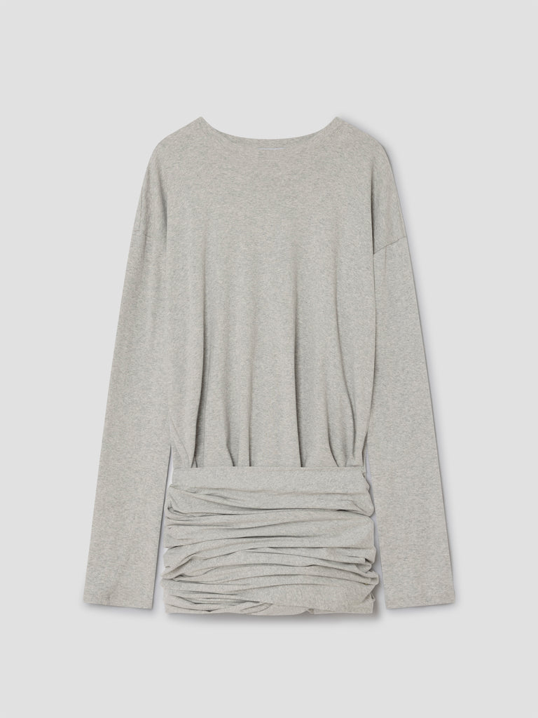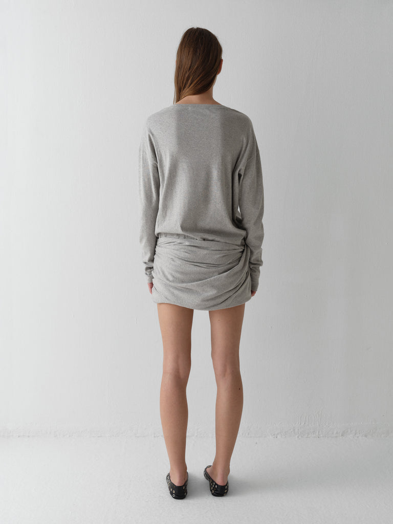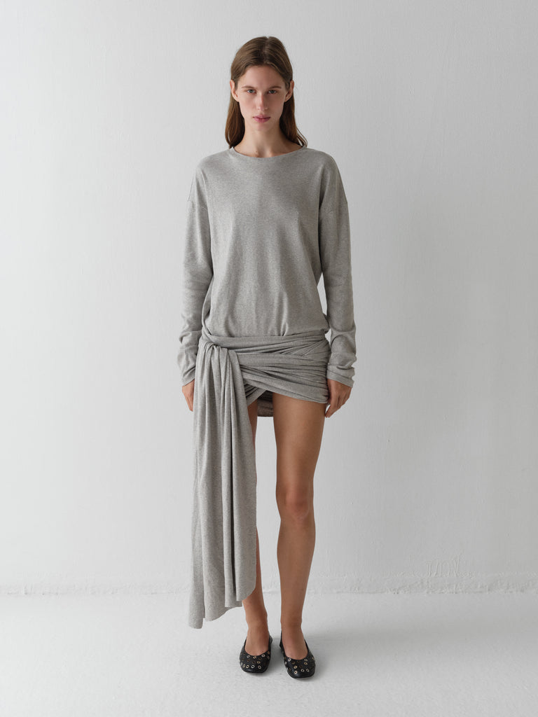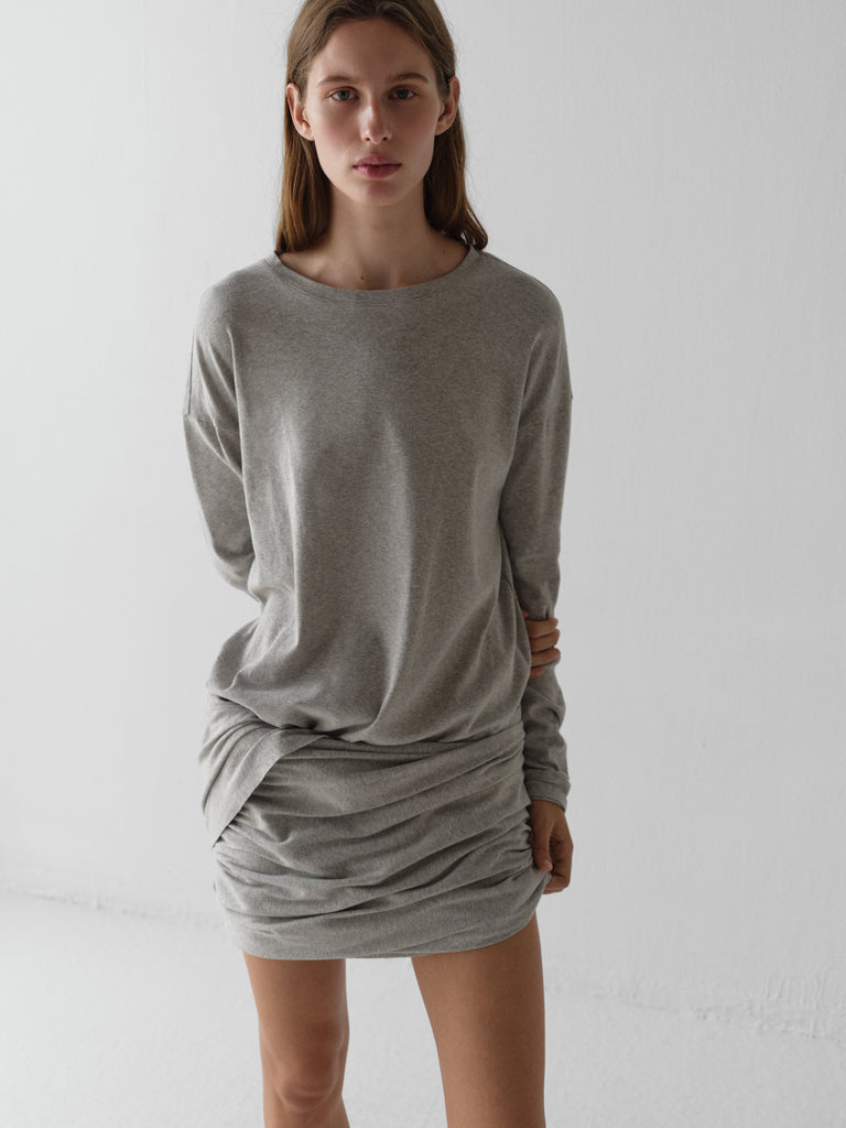 Convertible grey-melange garment worn as a mini dress, t-shirt, or in hooded style.