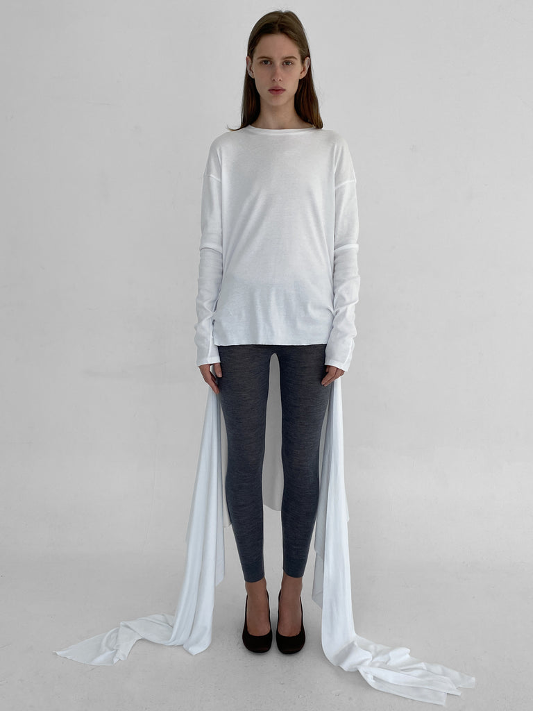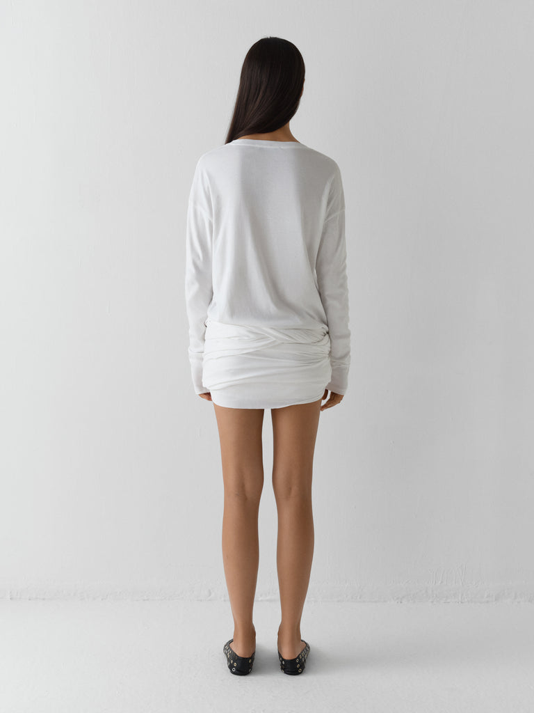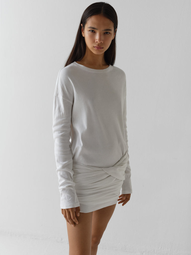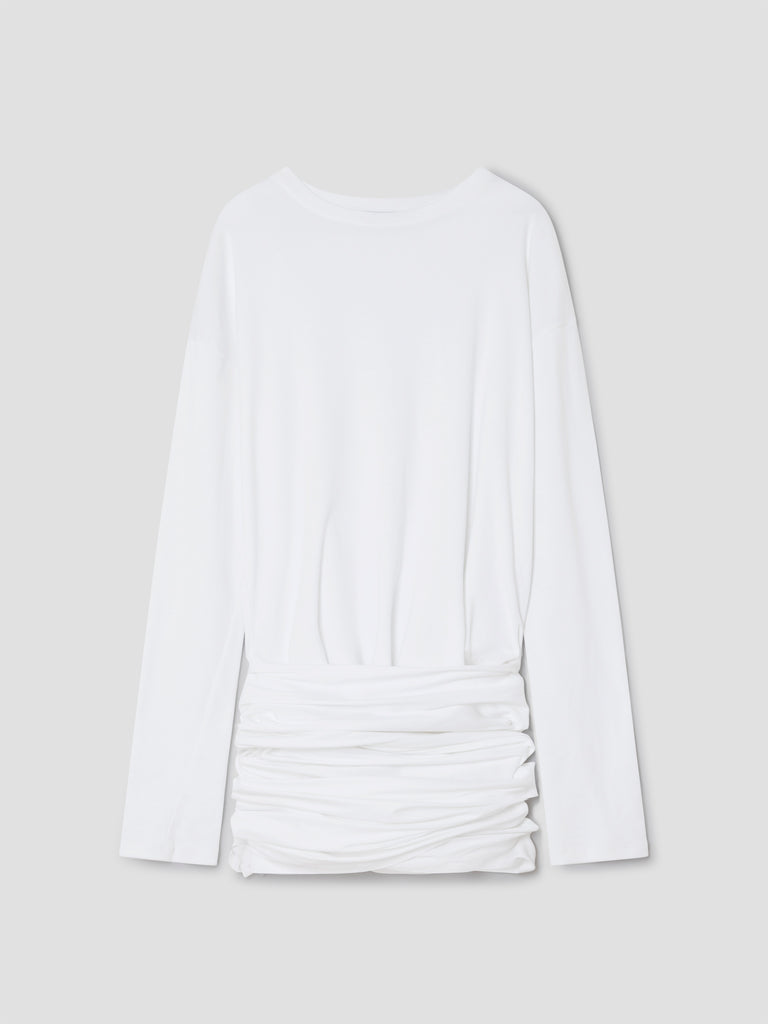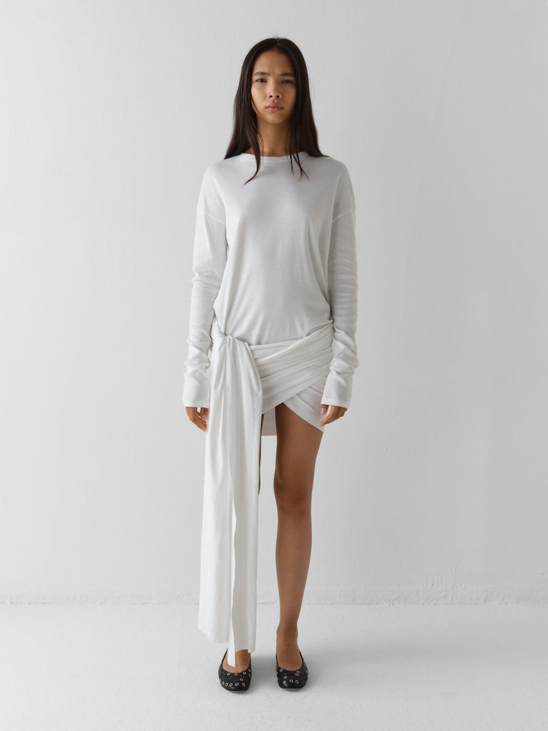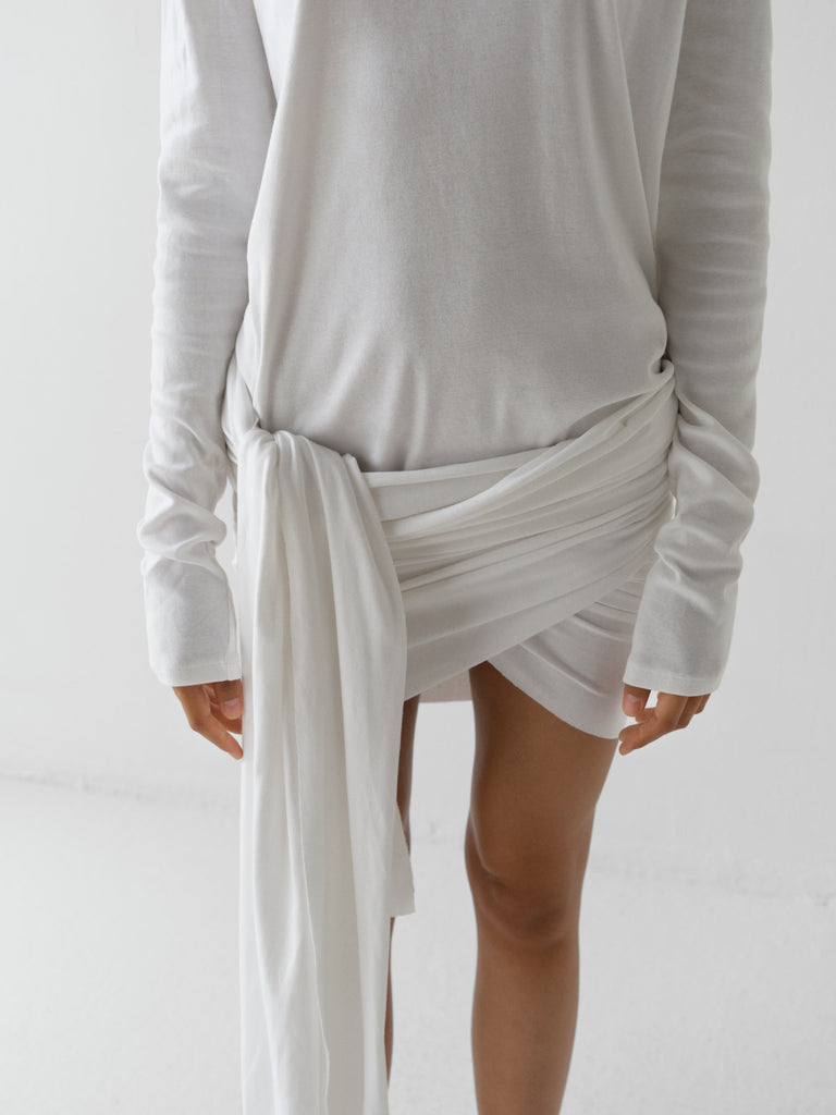 Convertible white garment worn as a mini dress, t-shirt, or in hooded style.