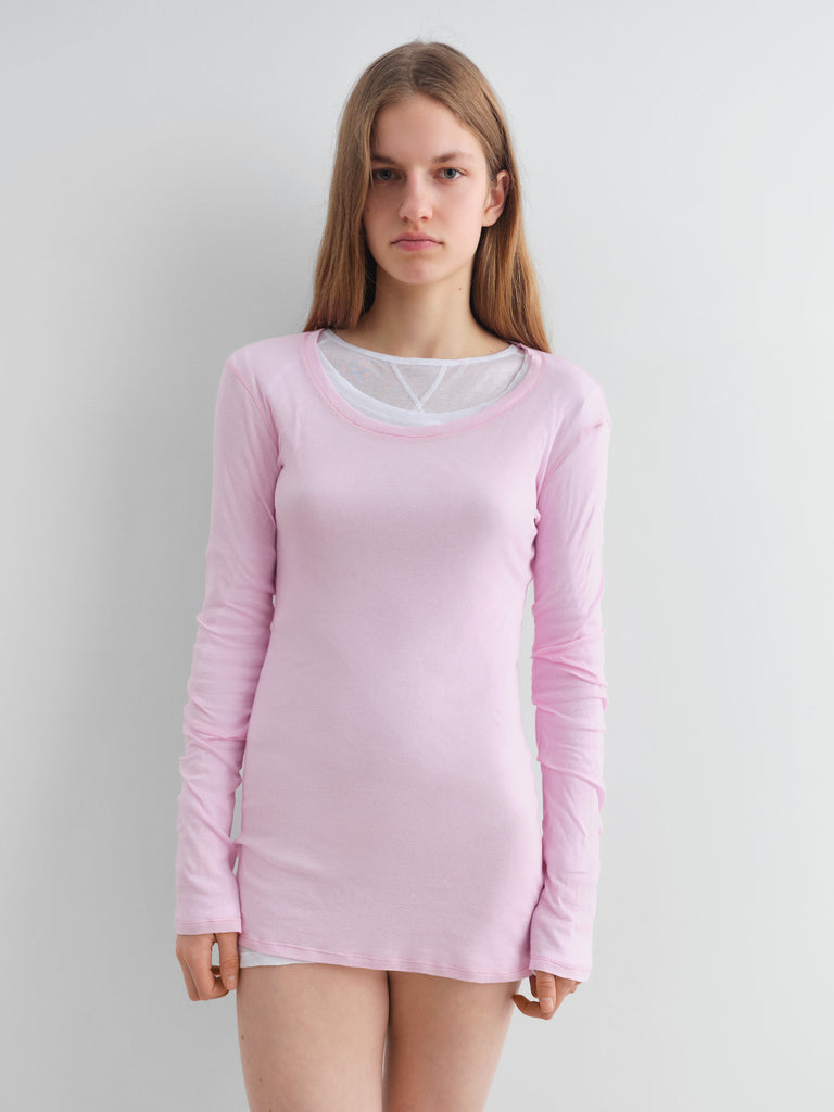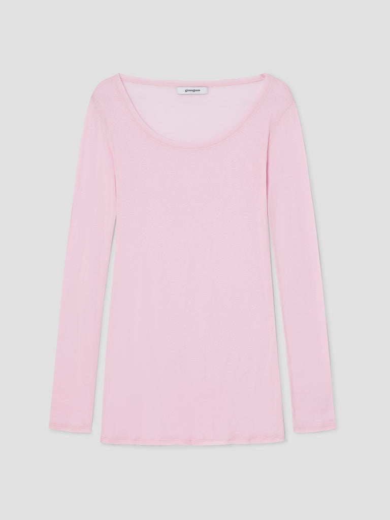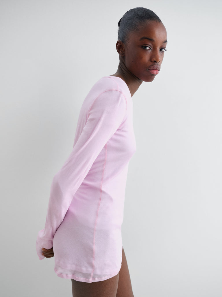 Soft pink cotton mini dress with a sheer finish.