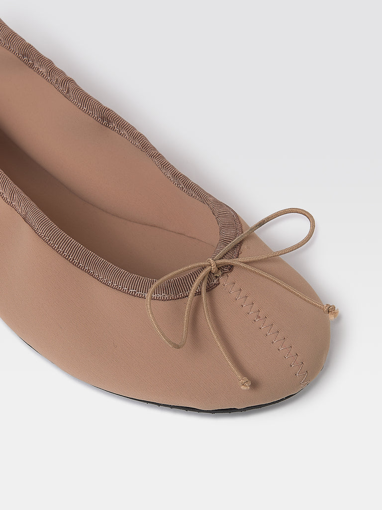 Nude neoprene ballet flats with grosgrain trim and tonal zigzag stitching. Adjustable front drawstring for a custom fit. Soft interior and flexible rubber sole for effortless wear.