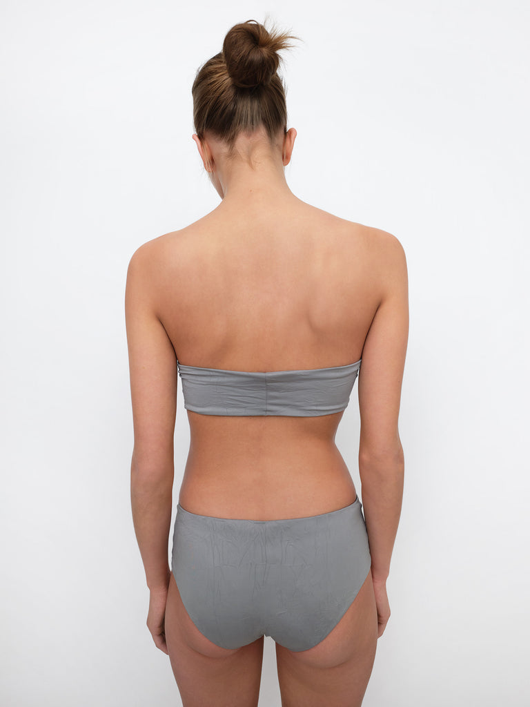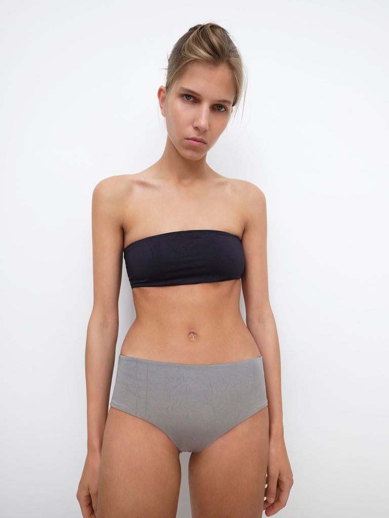 Reversible women's bikini top in grey and black. Strapless bandeau style crafted in fast-drying technical fabric with subtle texture. Clean silhouette, without visible seams.