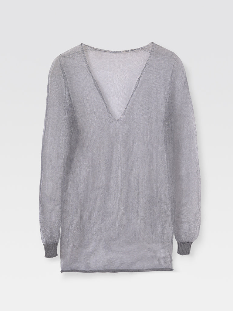 Sheer mini dress with long sleeves and V-neckline, crafted in an open knit fabric.