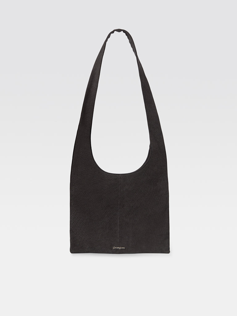 Black canvas women's cross bag with a long flat handle. Crafted from canvas with a subtle denim-like texture, it features a magnetic closure, one interior pocket, and two exterior pockets with stitched flap details for added dimension. Lined with cotton and finished with a metallic Gimaguas logo on the back.