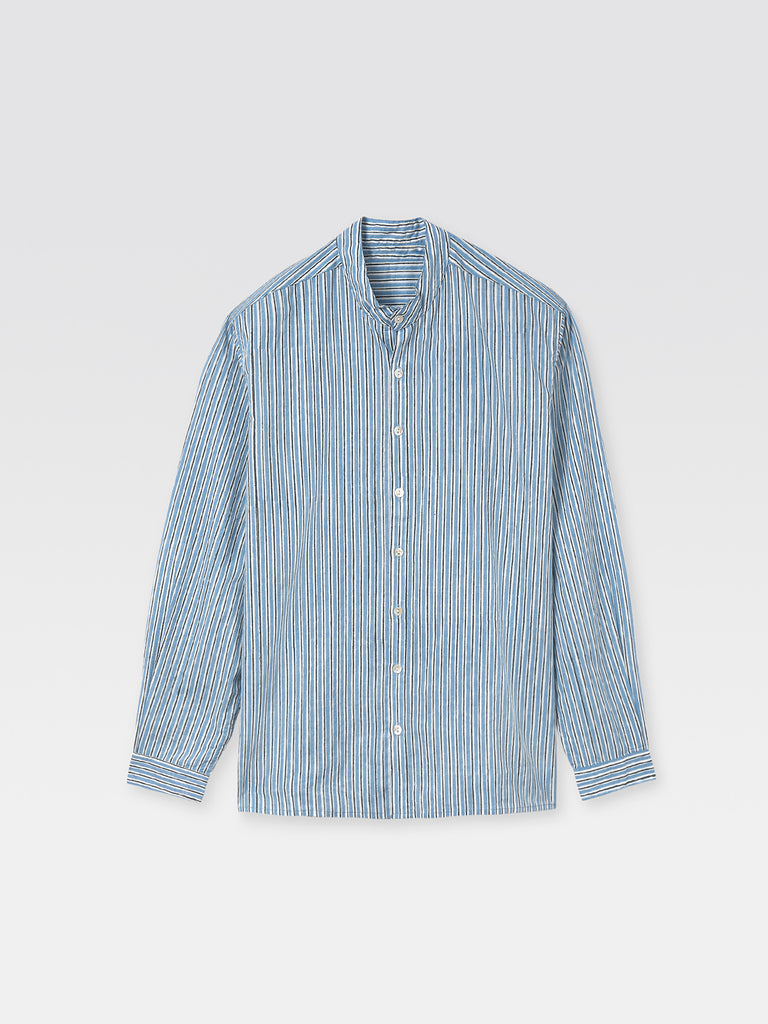 Long-sleeved shirt with Mao collar. Printed in traditional technique of block printing in color blue, white and black stripes.