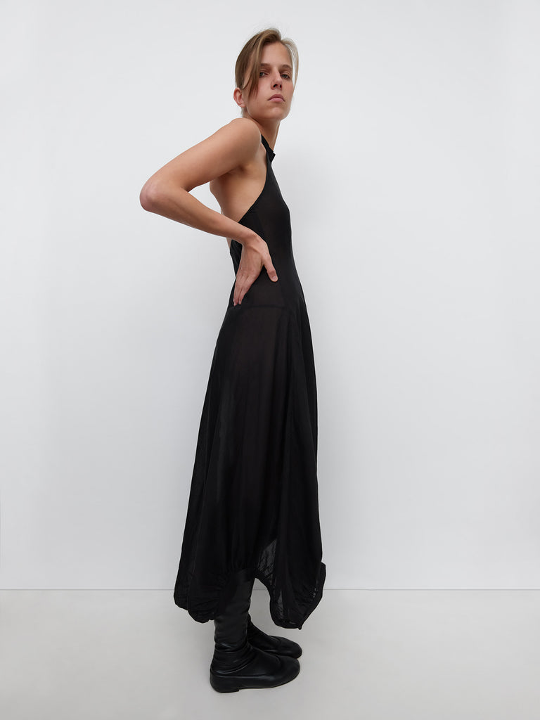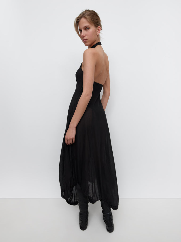 Black women's halter-neck maxi dress. Designed with an airy silhouette featuring a gathered bubble hem for added volume. Finished with a self-tie detail at the bottom and an open-back design.