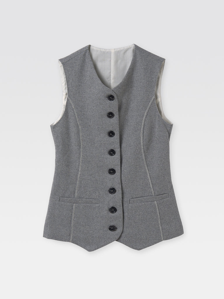 Tailored vest made from wool fabric, featuring color contrast buttons and stitches in grey.