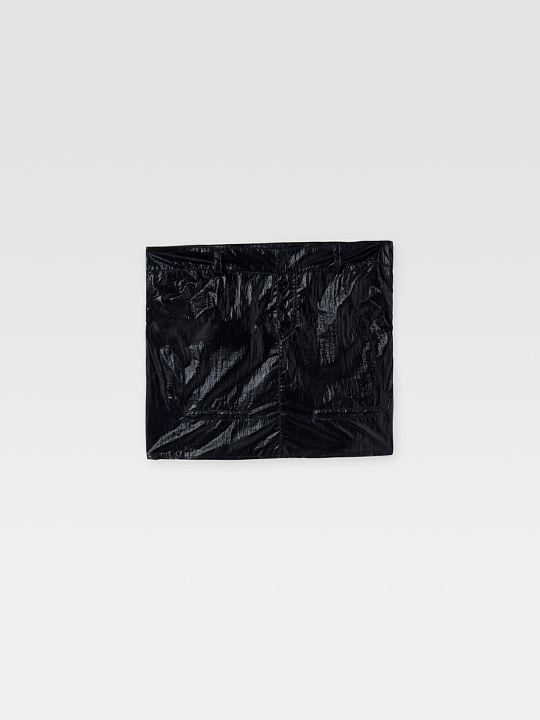 Sleeveless fitted top. Crafted from black shiny fabric.