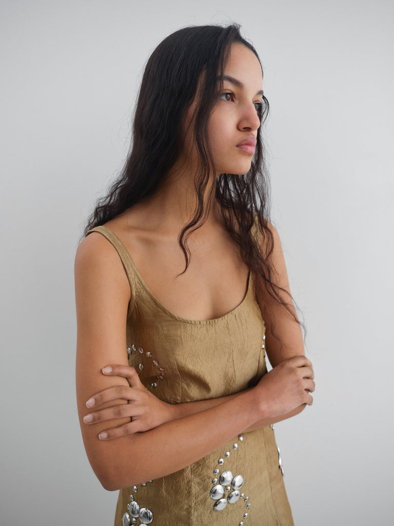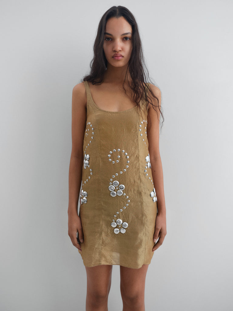Golden sleeveless mini dress with floral stud details.