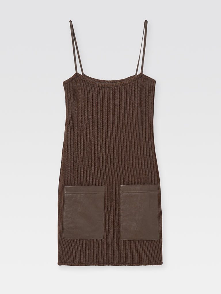 Chocolate-brown ribbed women’s mini dress with leather detailing. Features slim leather straps and two patch pockets in leather on the front. Designed for a form-fitting silhouette.