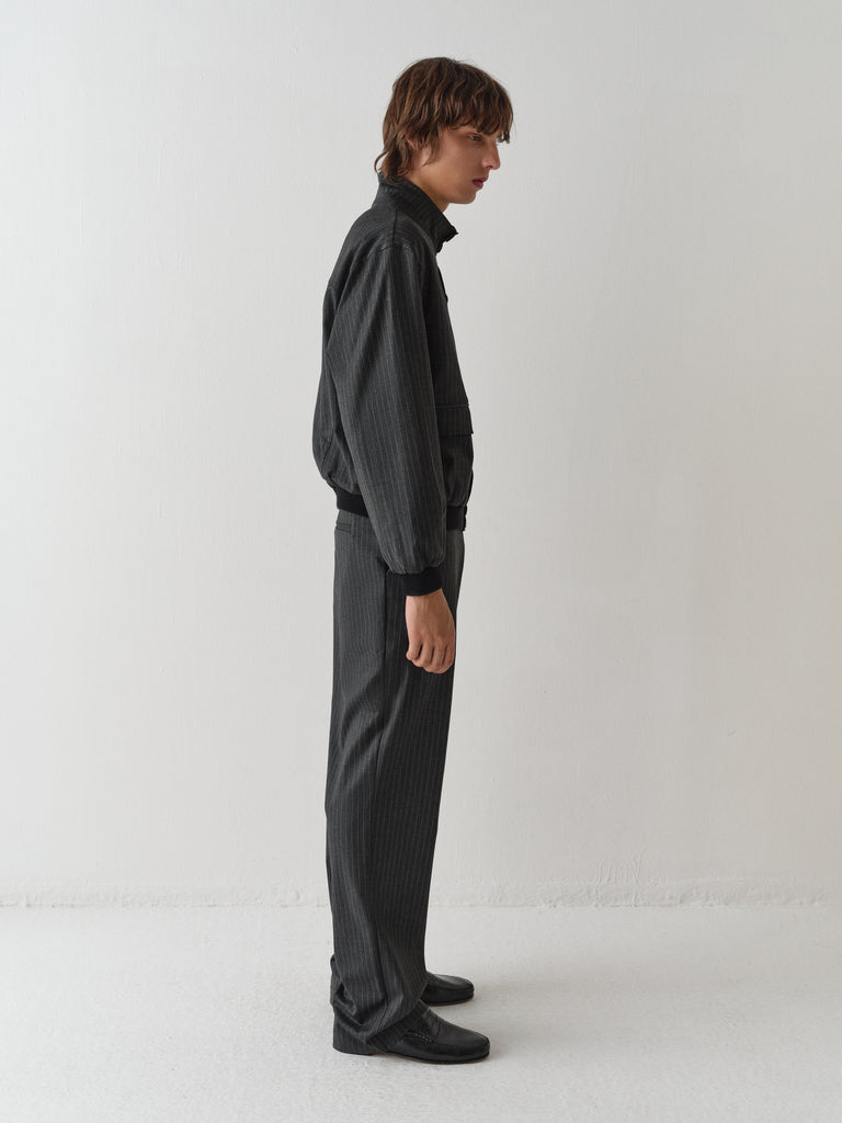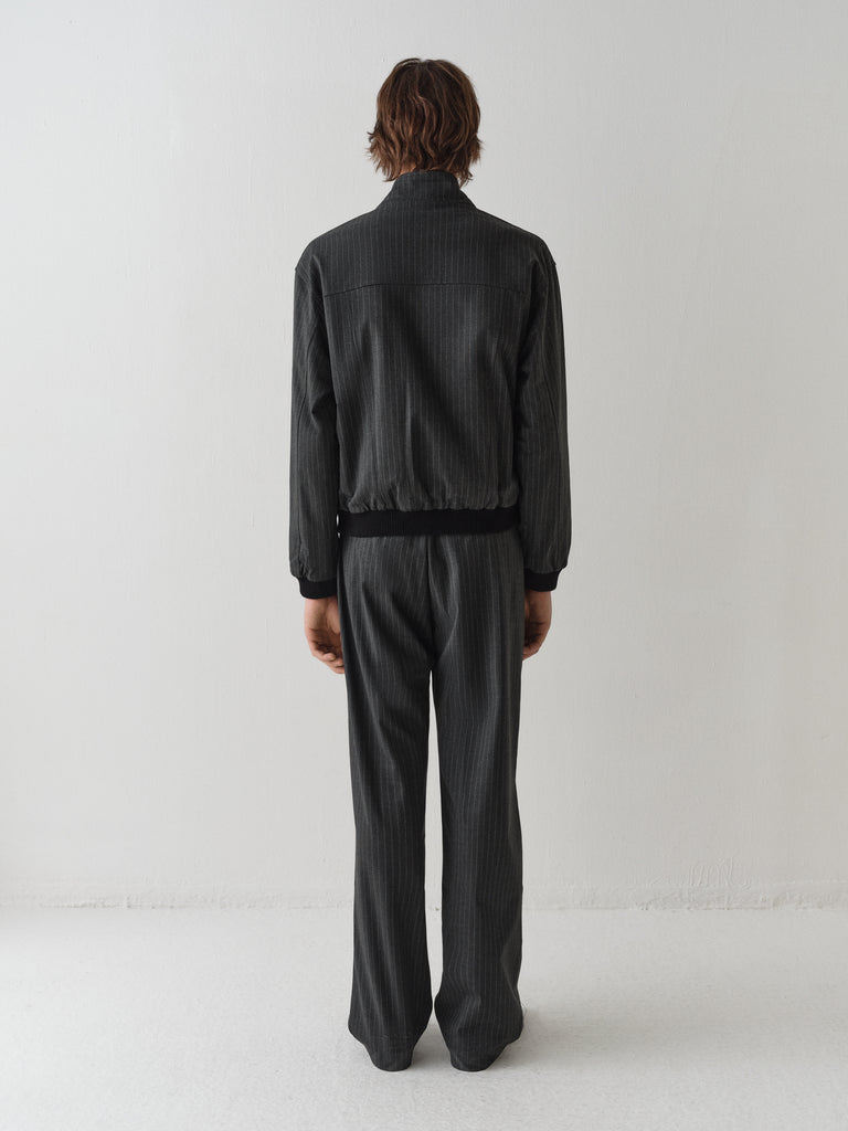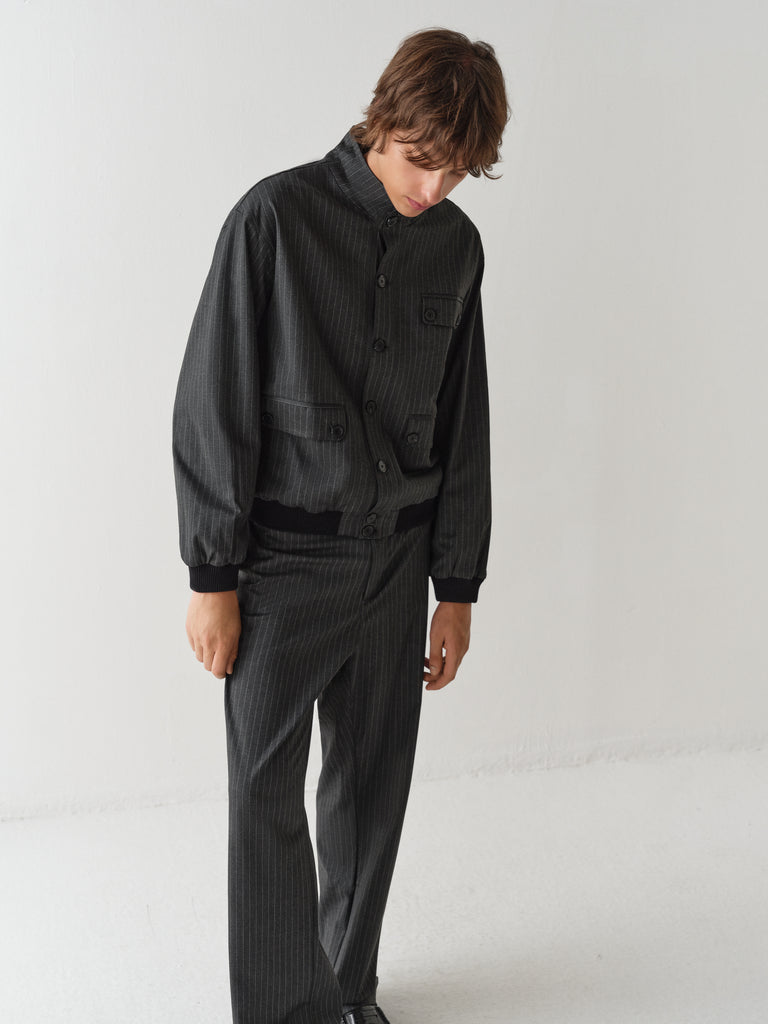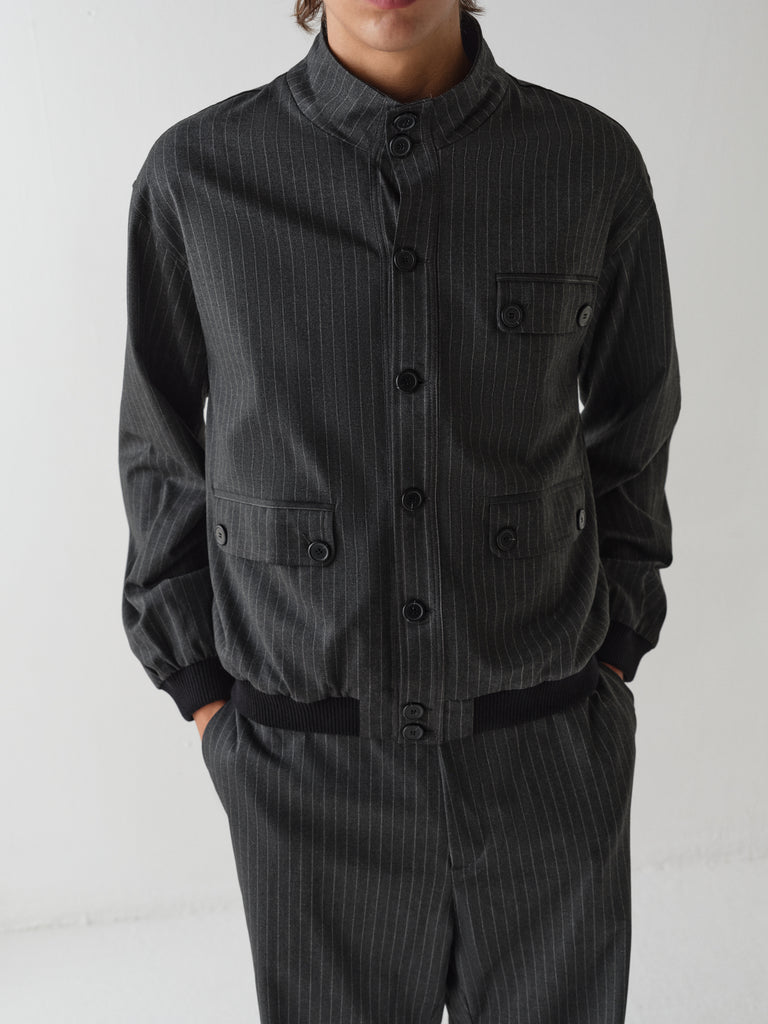 Grey pinstripe jacket with button closure.