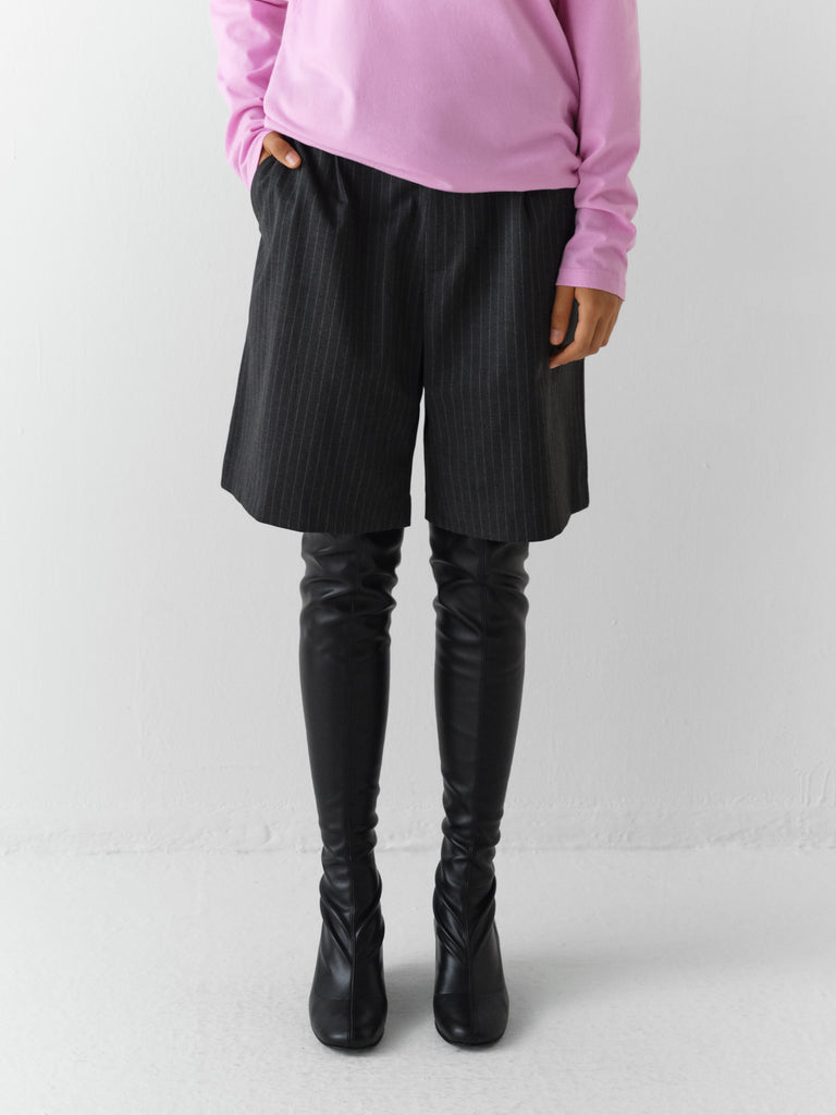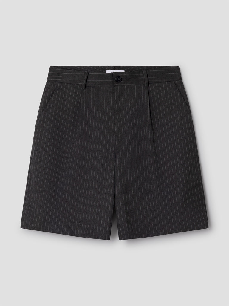 Tailored grey shorts with pinstripe pattern.