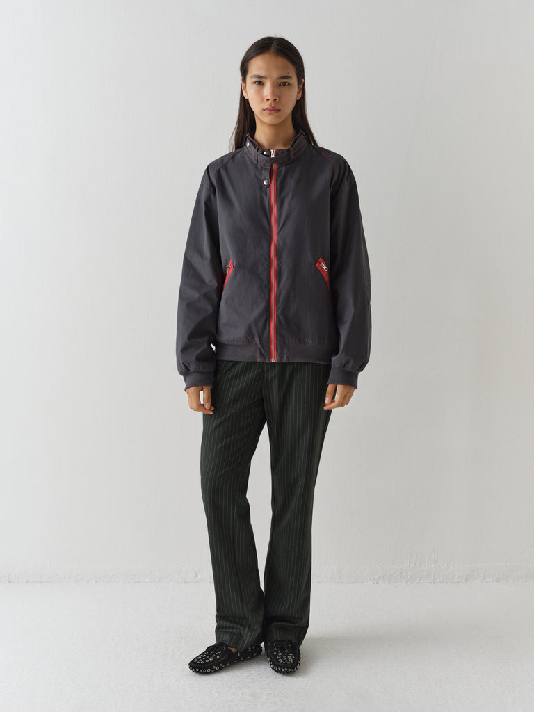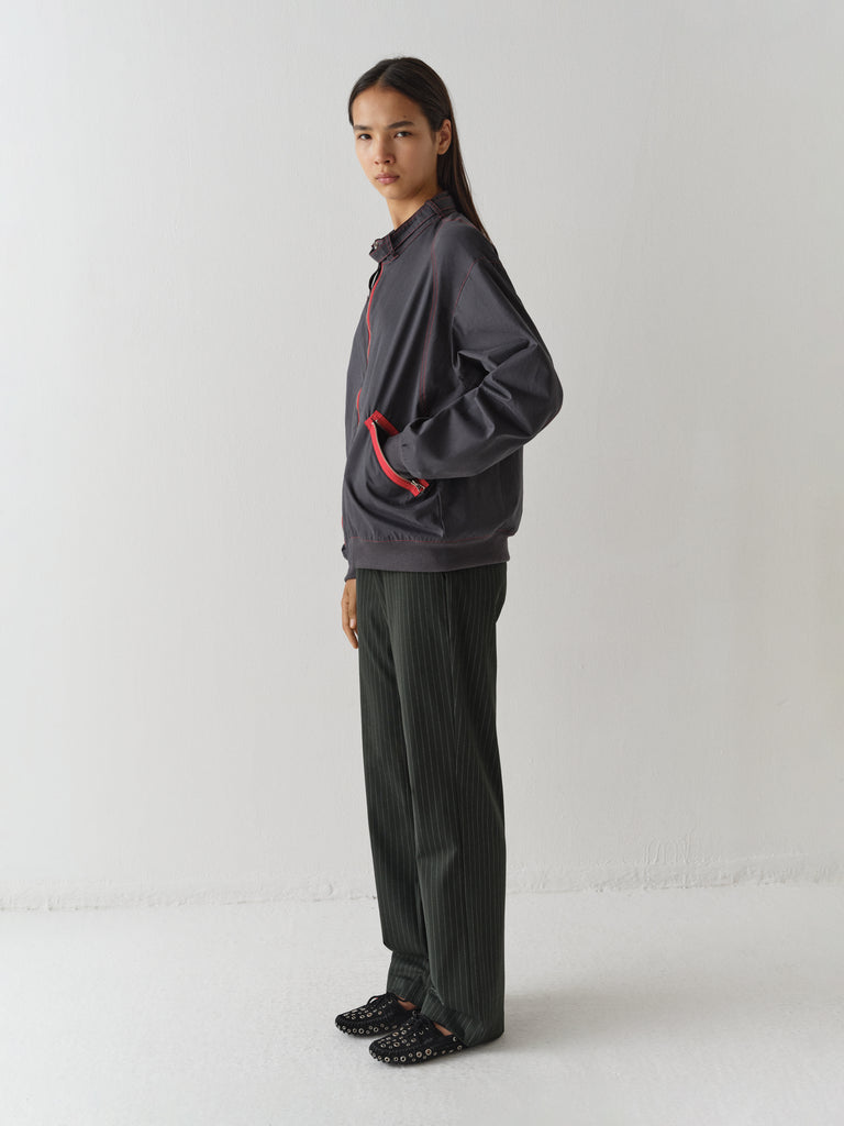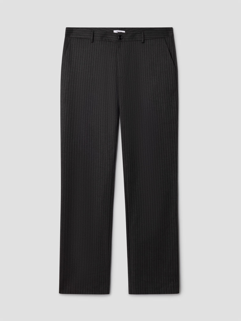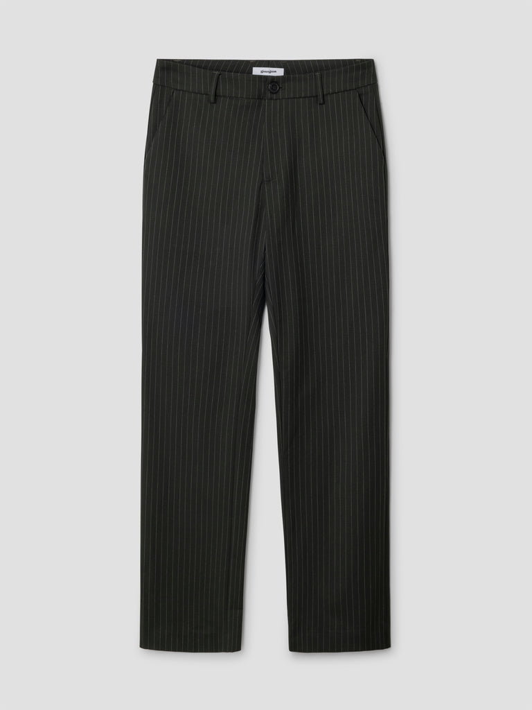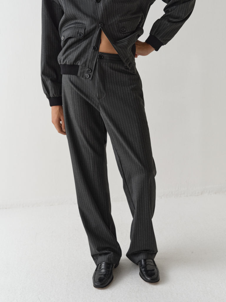 Tailored grey trousers with pinstripe pattern.