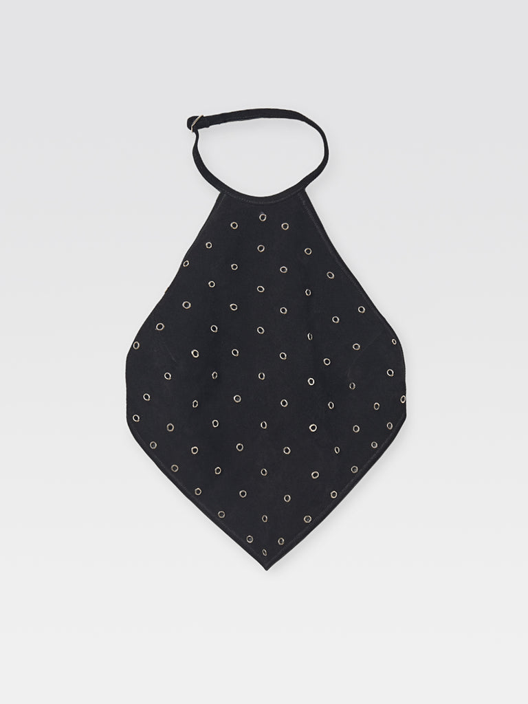 Women’s black suede top with a triangular silhouette and metal eyelet detailing.