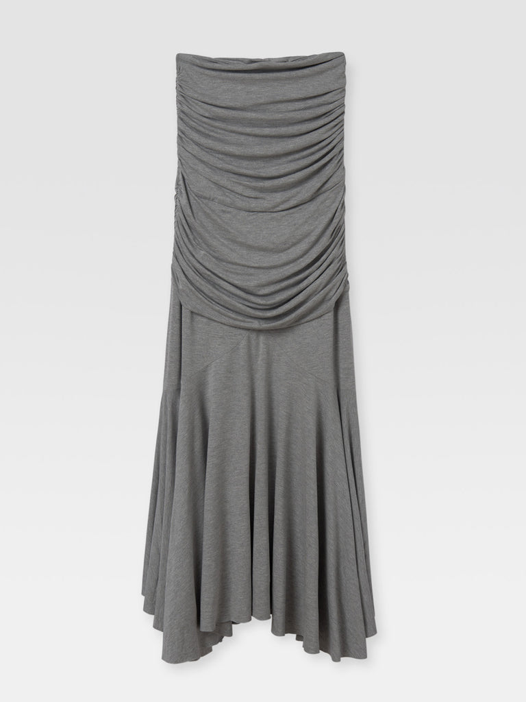 Asymmetrical maxi bandeau dress, with gathered detailing in grey.