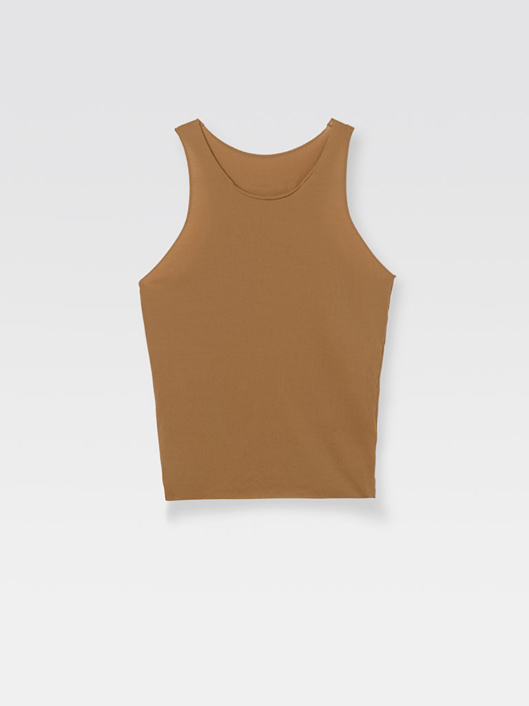Seamless fitted tank top in beige with the Gimaguas logo at the back.
