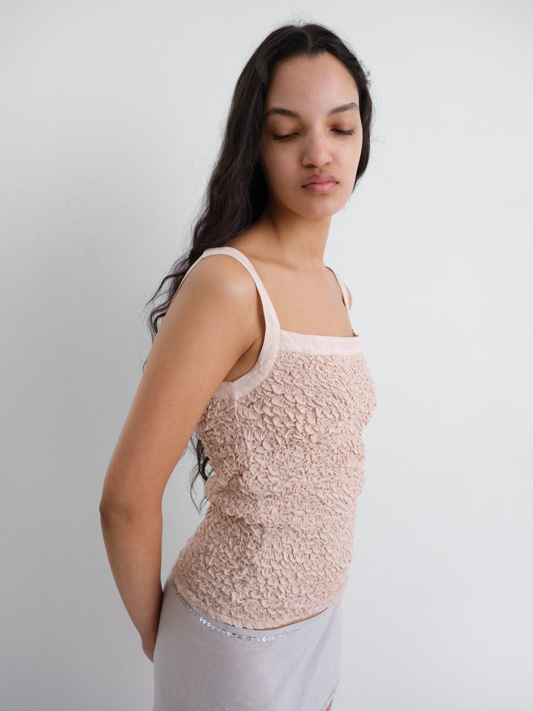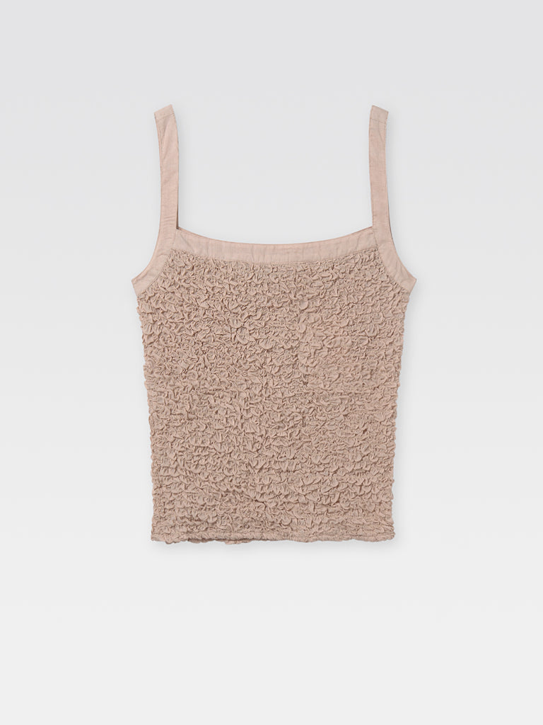 Grey women's cotton top with ruched body and structured straps. Made from lightweight fabric with stretch detail for a close fit. Sleeveless and slightly cropped.