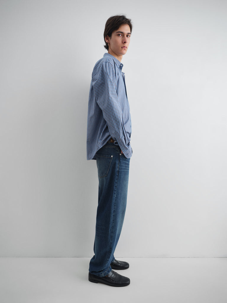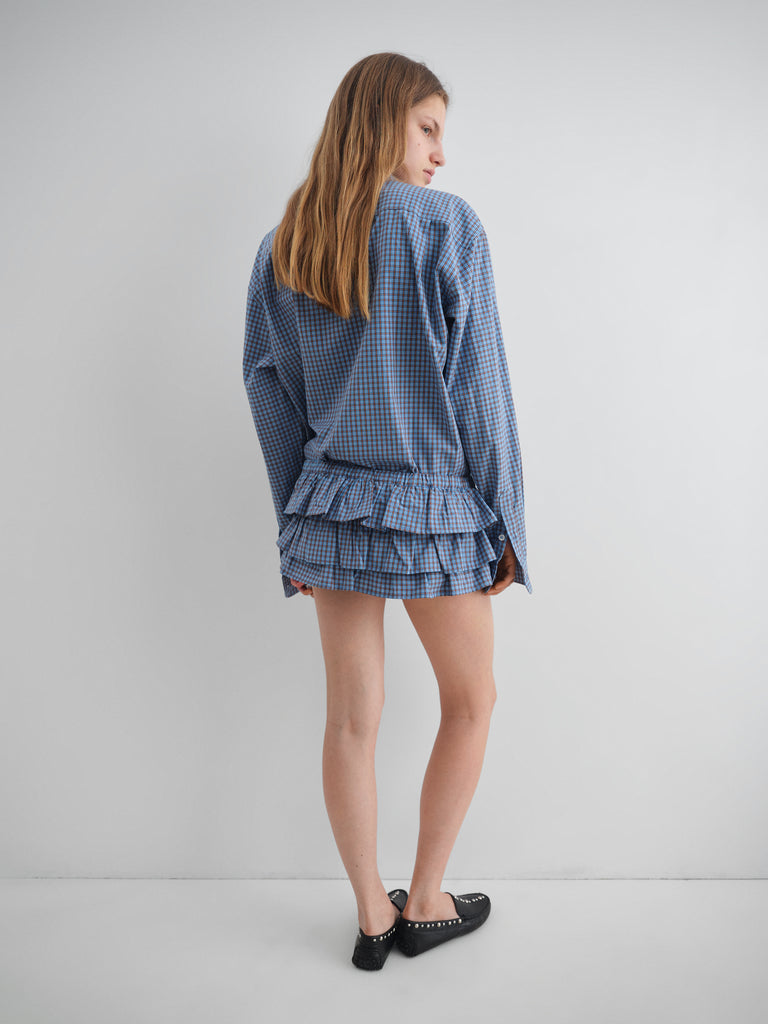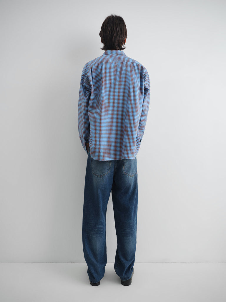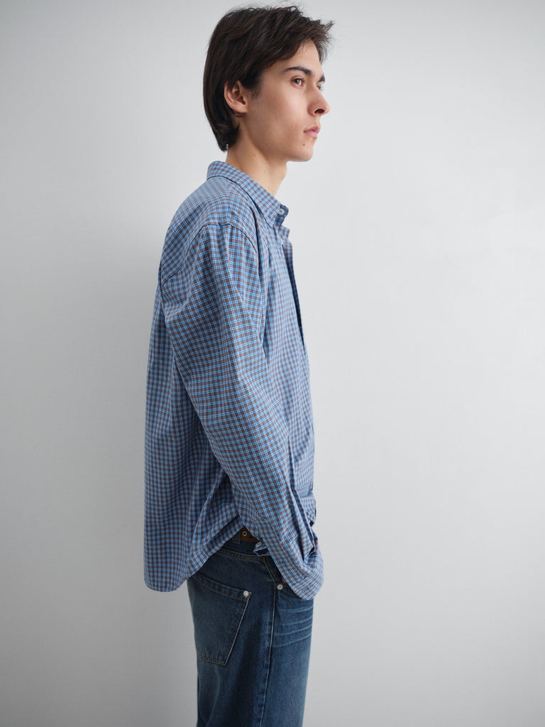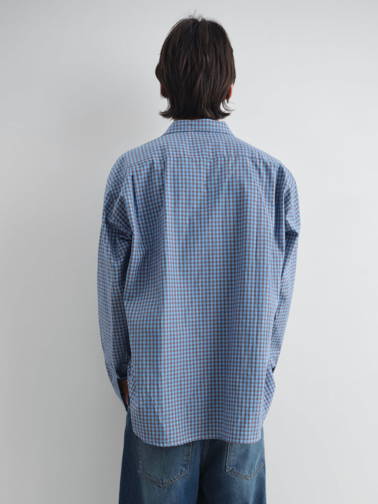 Blue checkered shirt with front pocket.