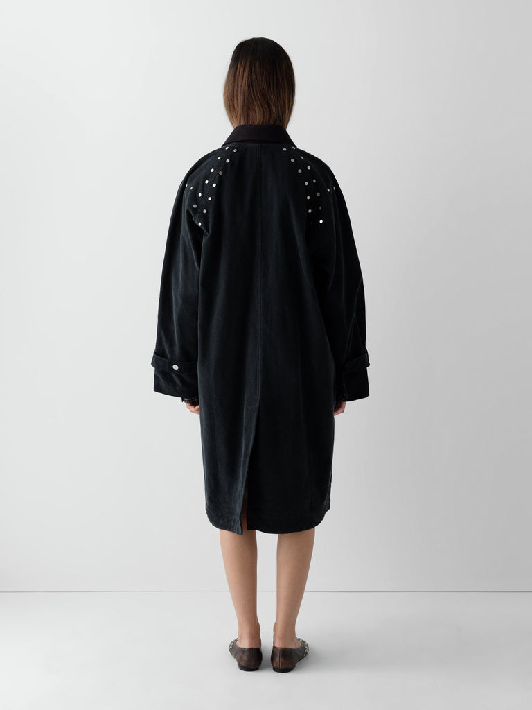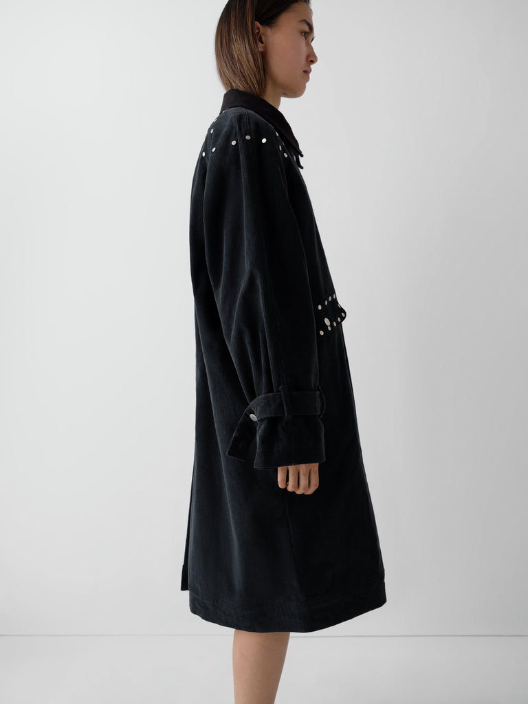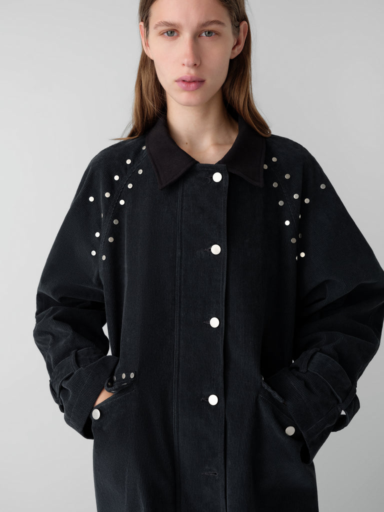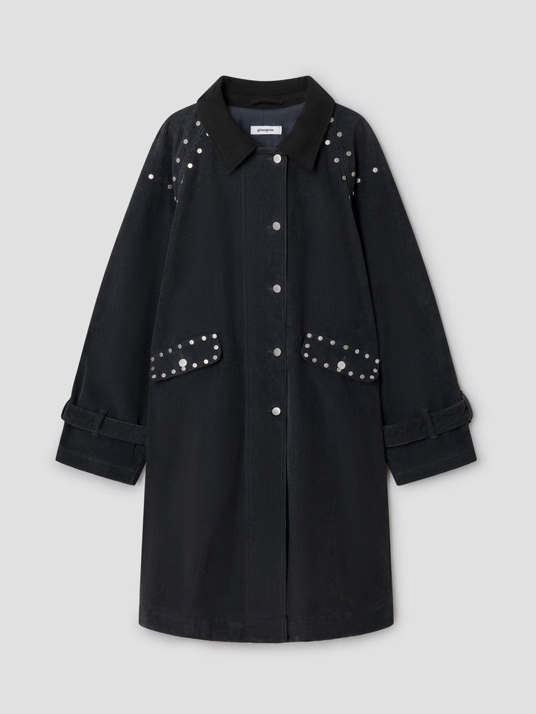Dark grey corduroy long coat with silver-tone studs.