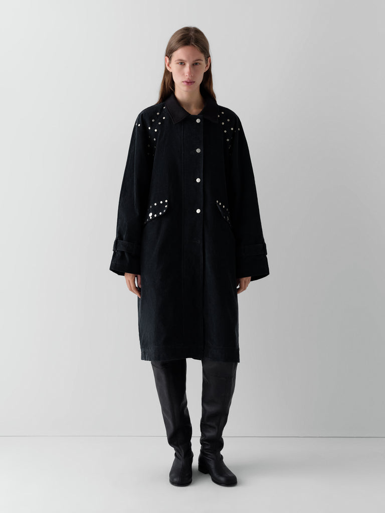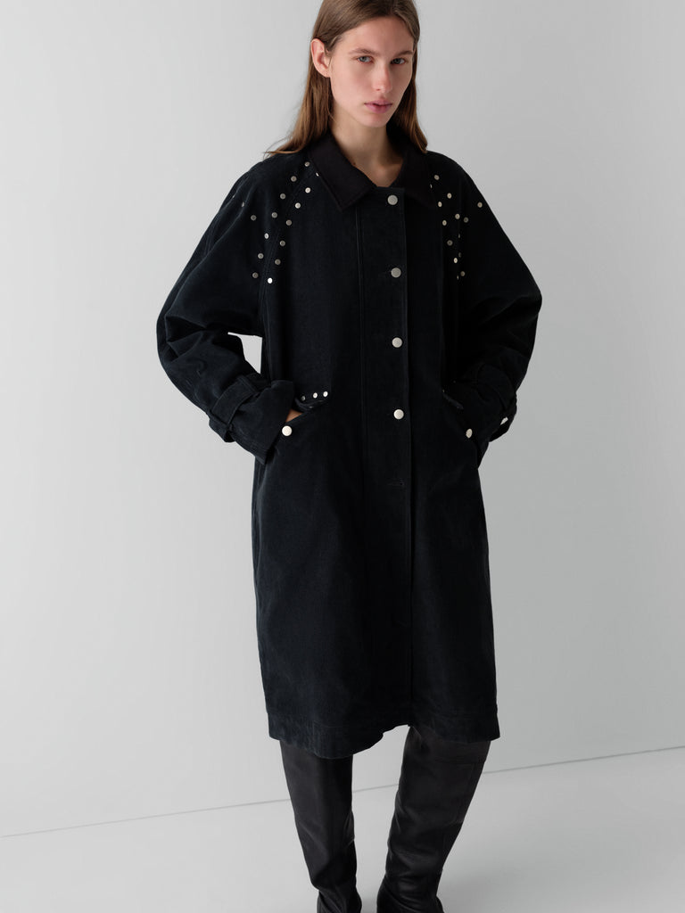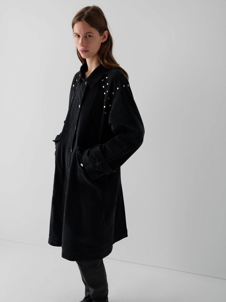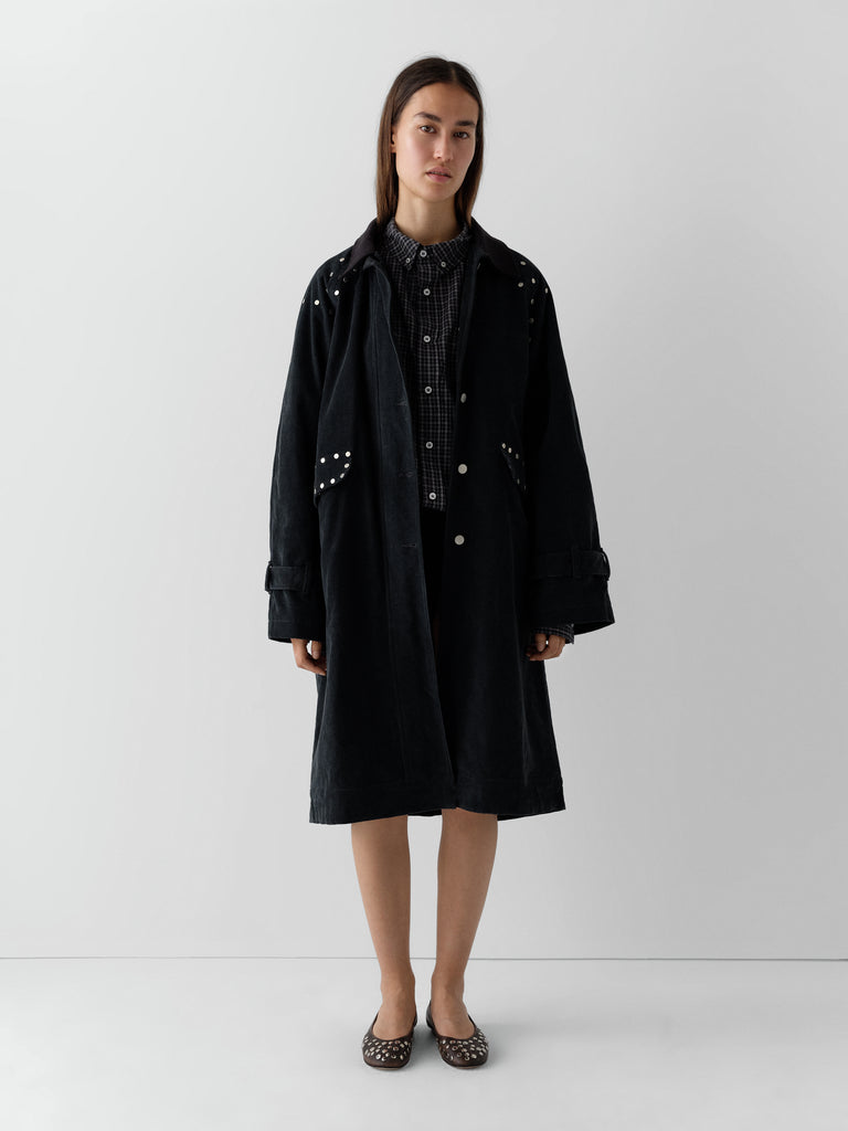Dark grey corduroy long coat with silver-tone studs.