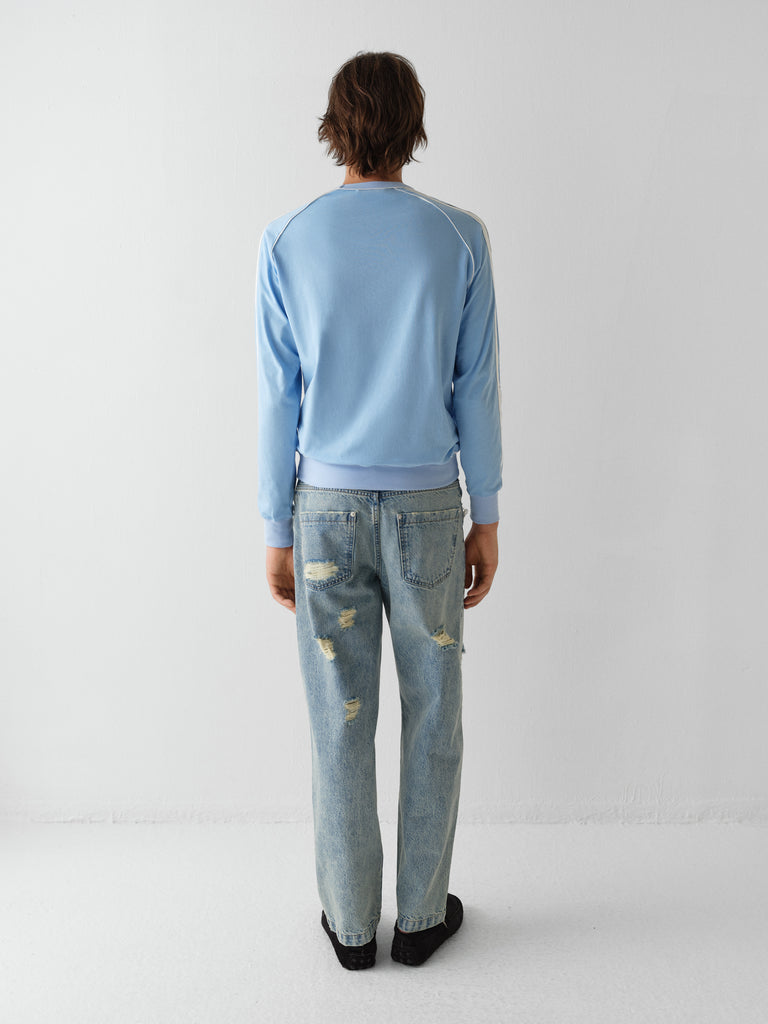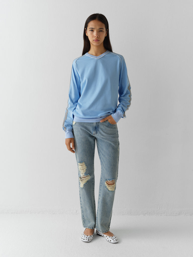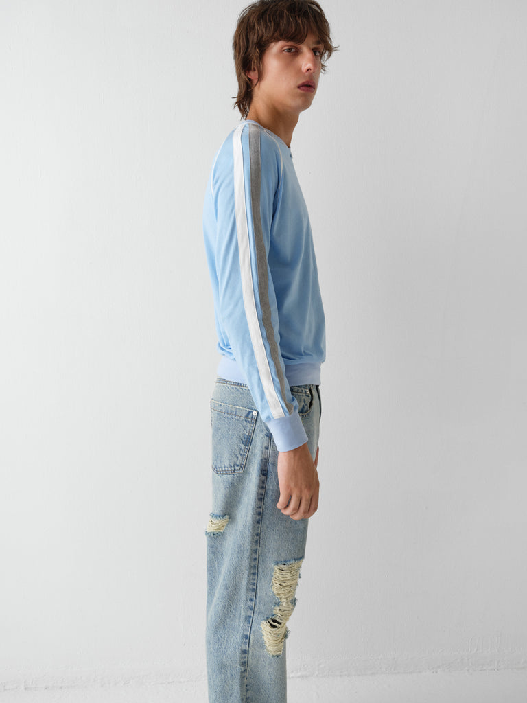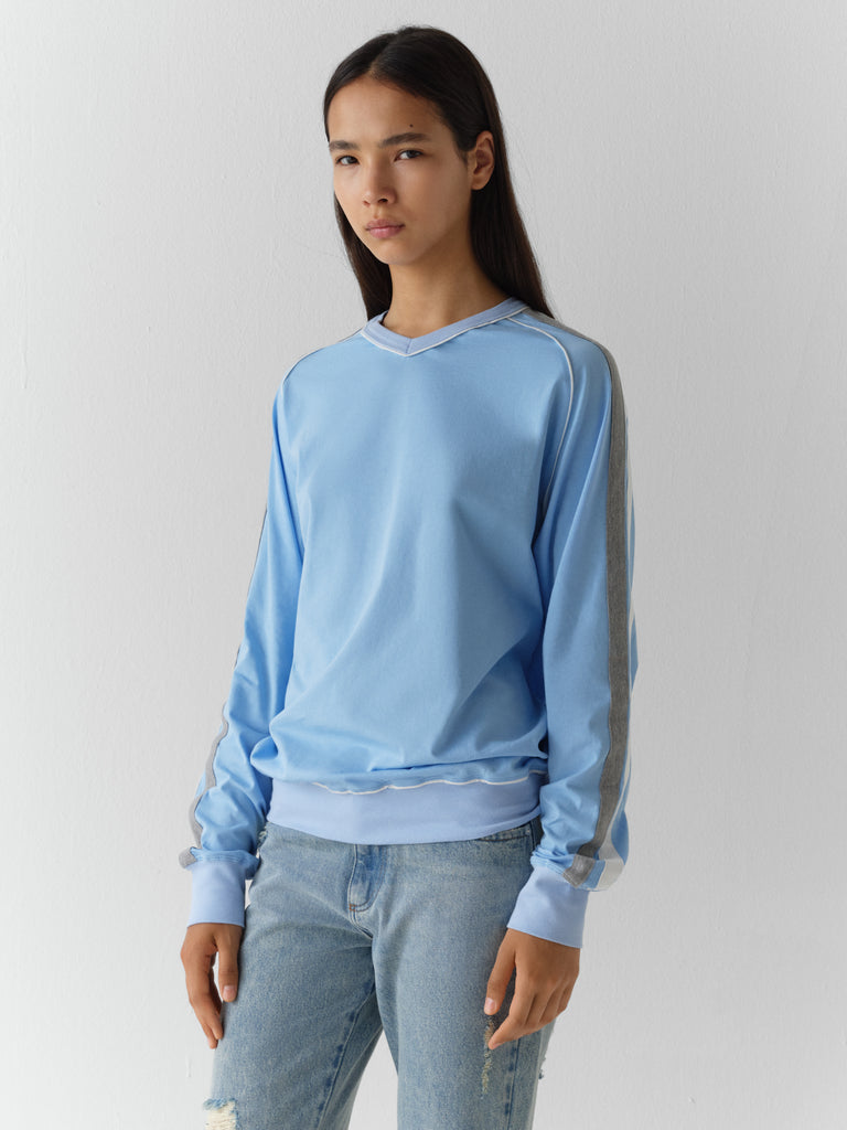 Light blue long-sleeve t-shirt with grey and white strap detail.